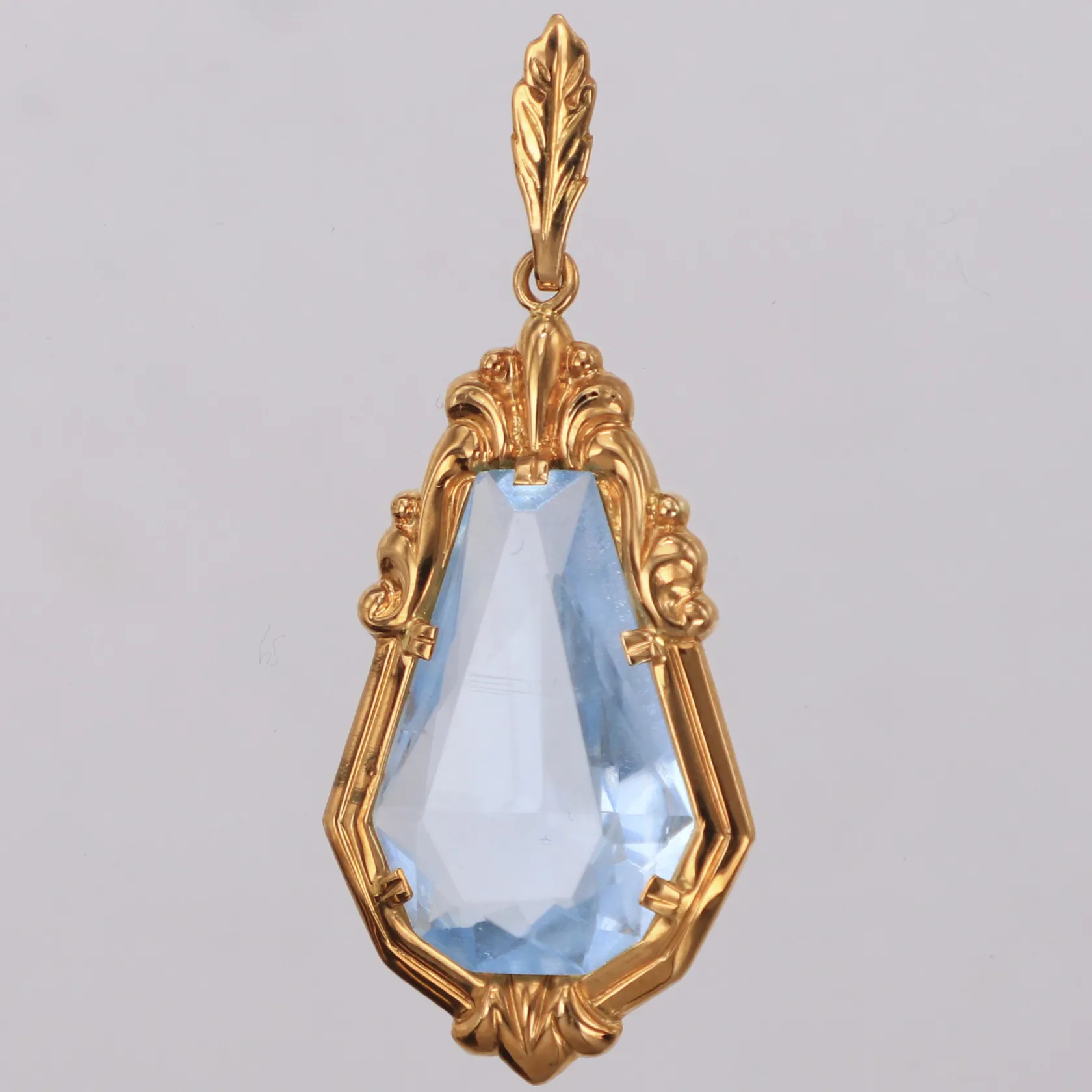 Hänge med ljusblå sten, längd ca 43mm, bredd 17,8mm, Guldvaruaktiebolaget G. Dahlgren & Co Ab, Malmö, 18K Vikt: 3,2 g.