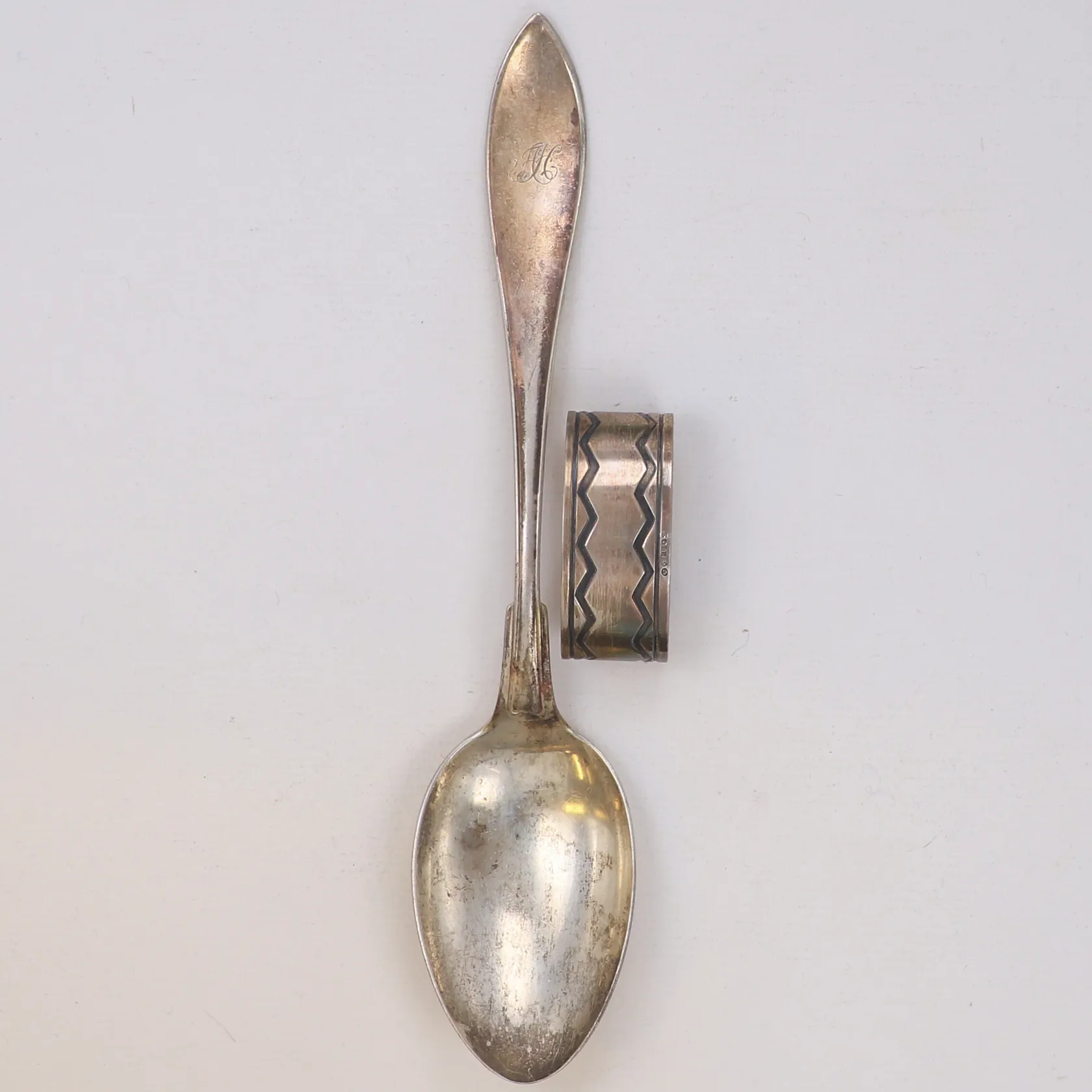Sked, servettring, gravyr, silver 830/1000 Vikt: 71,8 g.
