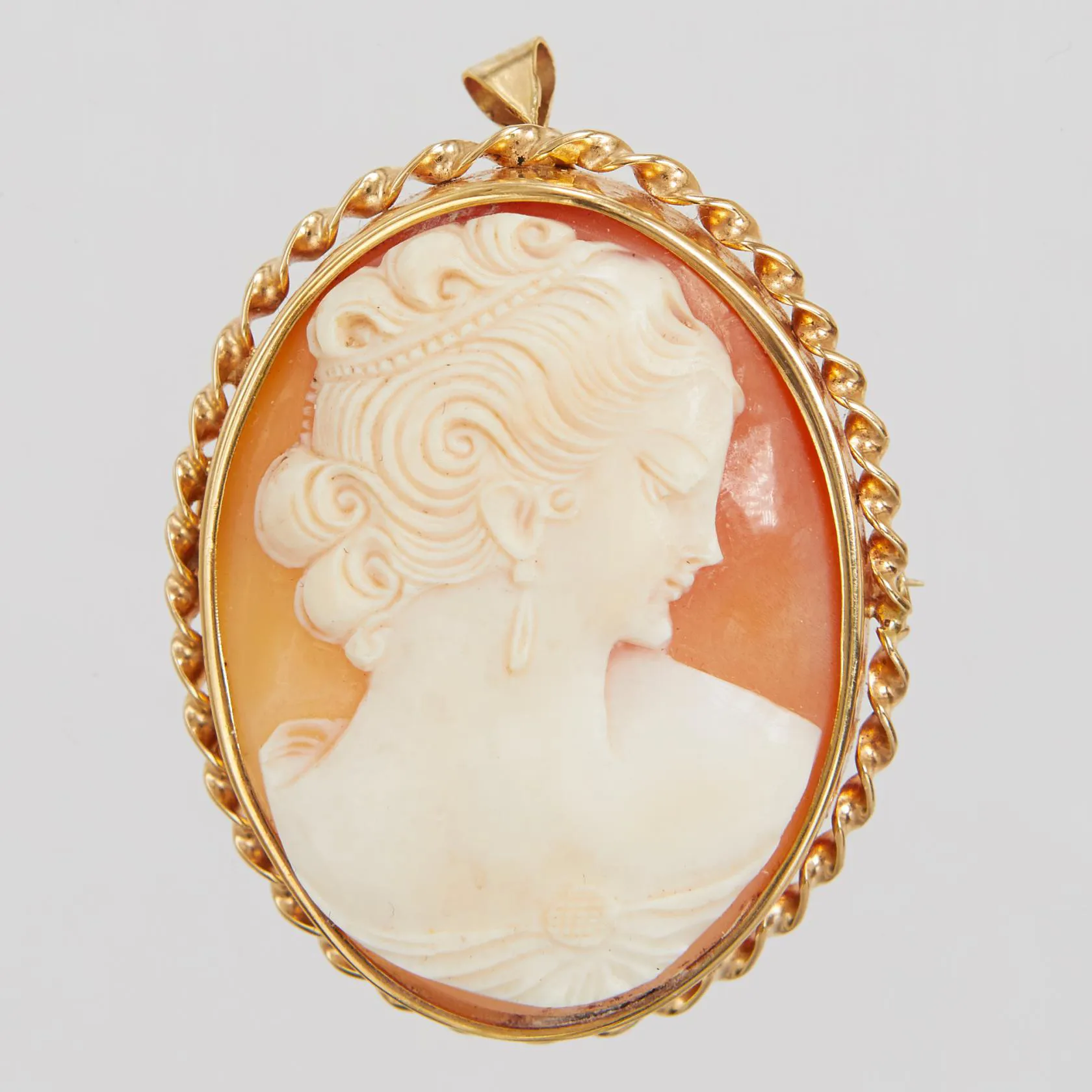 Brosch/hänge, kamè av snidat snäckskal, 50x36mm, 18K bruttovikt: 14,5g. Vikt: 14,5 g.