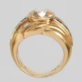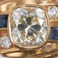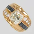 Ring med kuddslipad diamant 4,14ct enligt gravyr, kvalitet Ca-Lt.Y(N-O)/VS, briljantslipade diamanter totalt 0,54ct, samt safirer 1,94ct, vikter samt kvalitet enligt gravyr, stl: 17, bredd: 5,4-15mm, tillverkad av Kaplans, Stockholm, otydlig årsstämpel ca 1989-91, 18K guld, vikt 14,3g. finns för visning på kontoret Östermalm Vikt: 14,3 g.