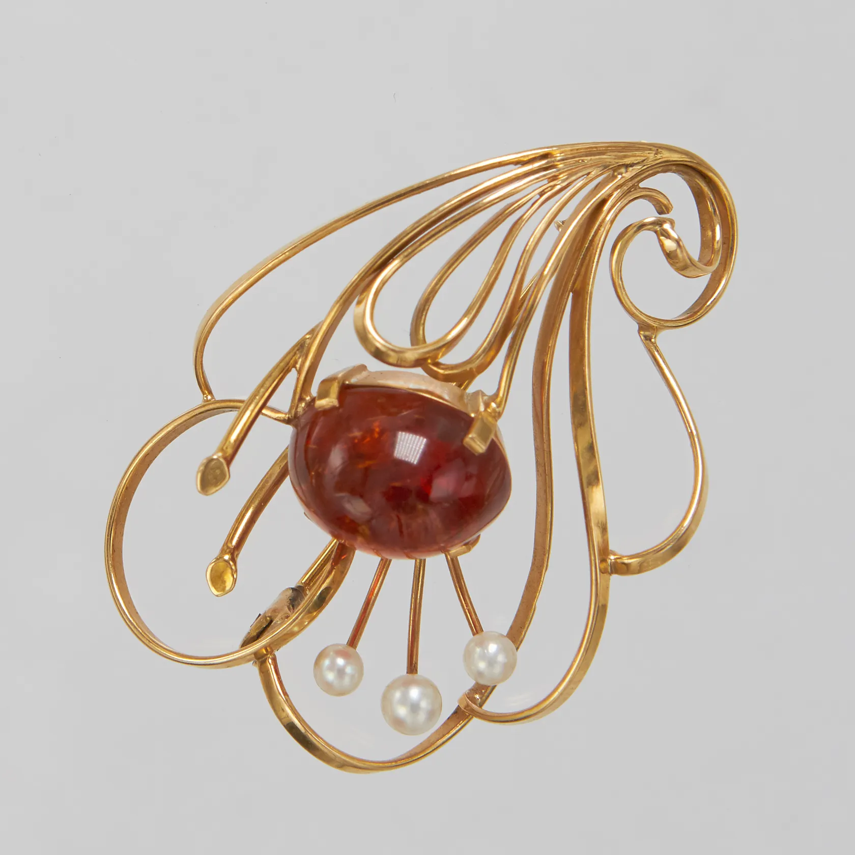 Brosch, bärnsten, odlade saltvattenspärlor Ø3-3,5mm, 46x32,5mm, 18K Vikt: 9,8 g.