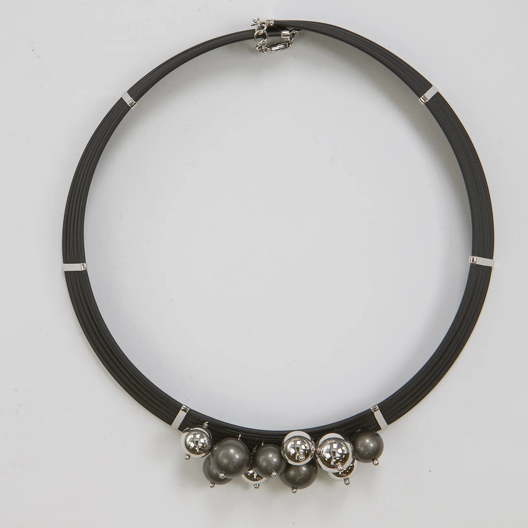 Collier, innermått Ø13-15cm, bredd: 14,5mm, gummi med vitguldsdetaljer, kulor i plast samt vitguld, 18K, bruttovikt 29,0g. Vikt: 29 g.