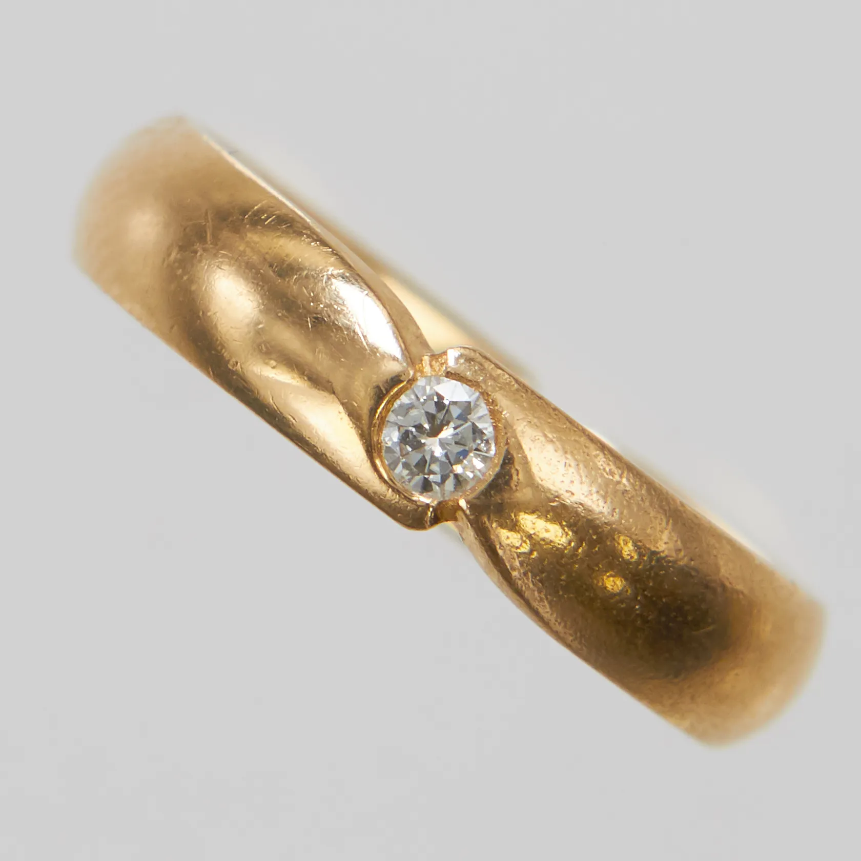 Ring, briljantslipad diamant 1 x ca 0,05ct, Ø15¾, bredd:4mm, gravyr, 18K Vikt: 4 g.