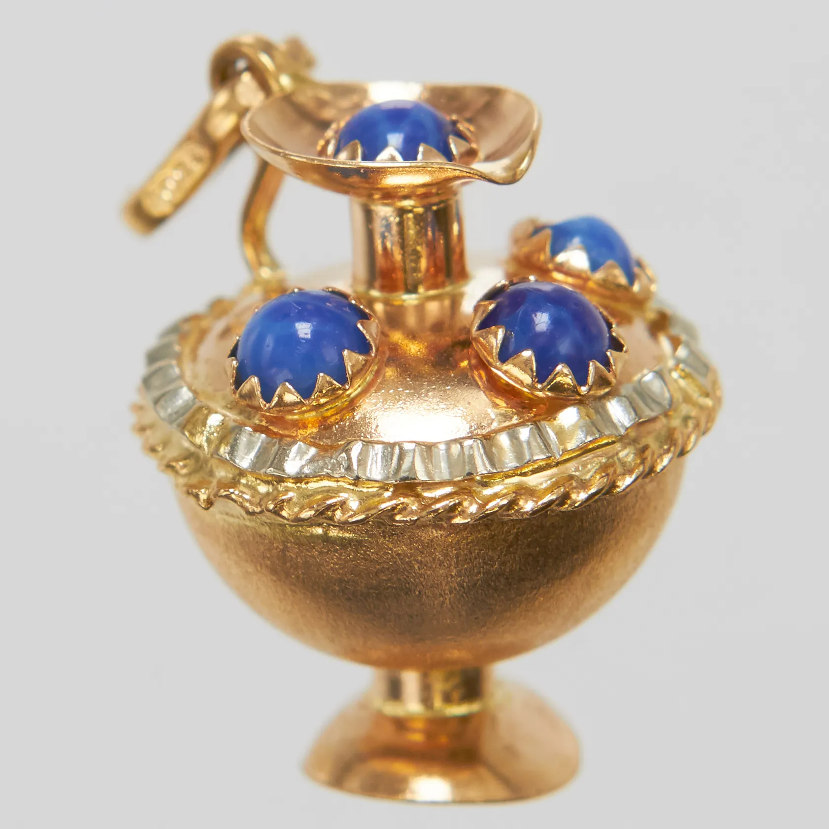 Hänge, blå glasstenar, längd ca 30mm inkl ögla, bredd 9-18mm, lätt skev, 18K Vikt: 5,7 g.