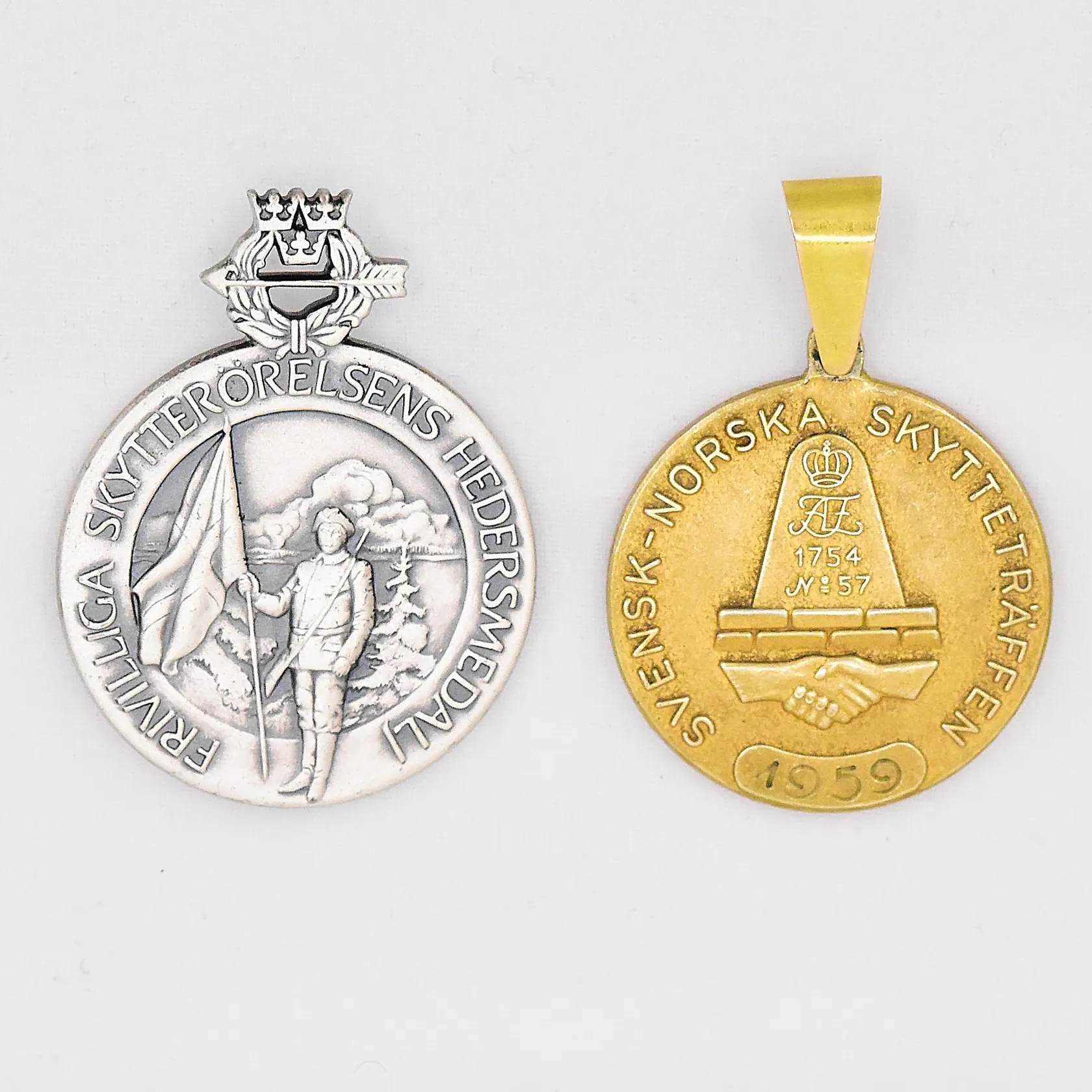 2 Medaljer, Ø 31-33mm, graverade, silver 830/925/1000 Vikt: 37,5 g.