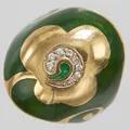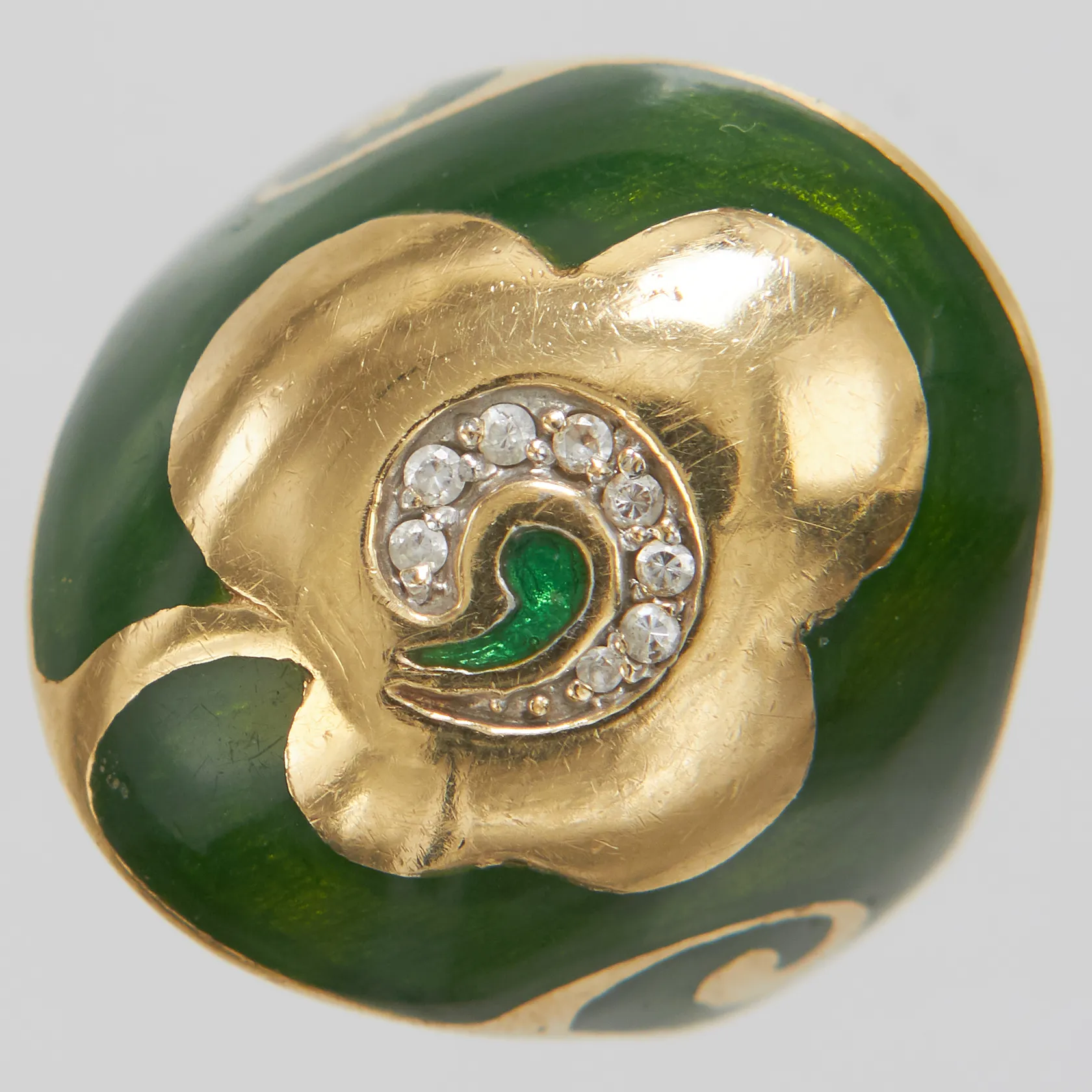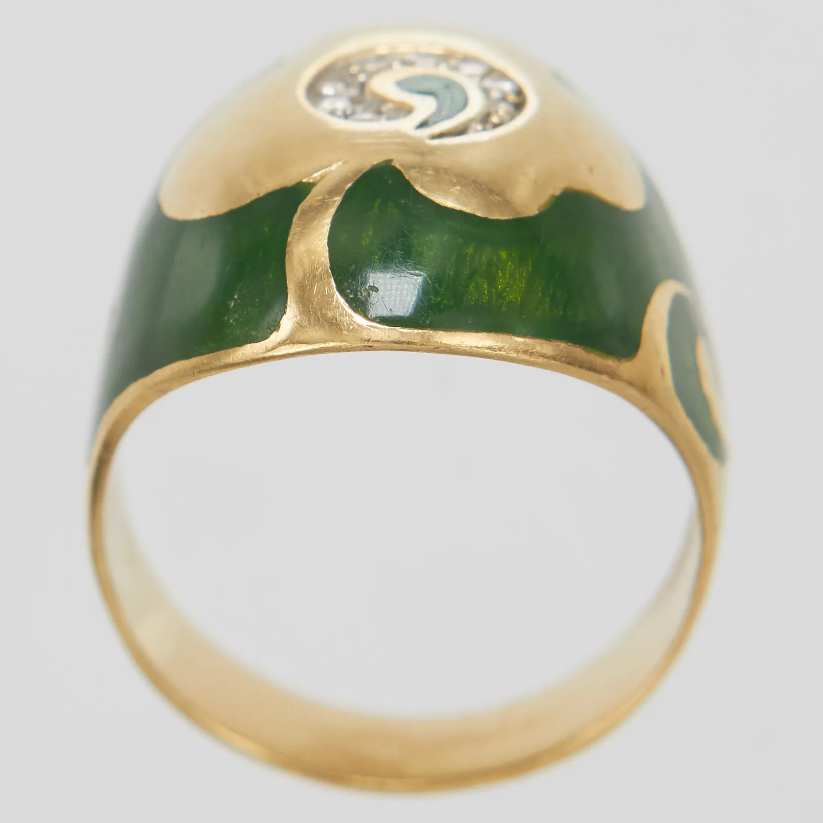 Ring med emalj samt vita stenar, Ø19½, bredd: 5-23mm, 14K Vikt: 8,5 g.