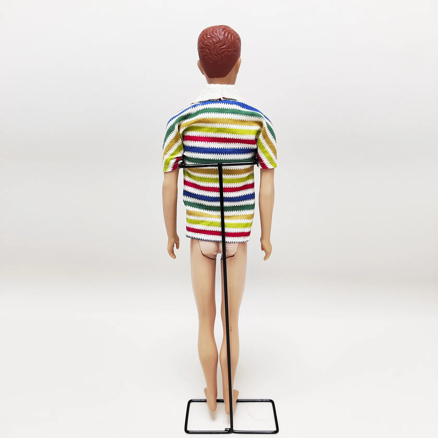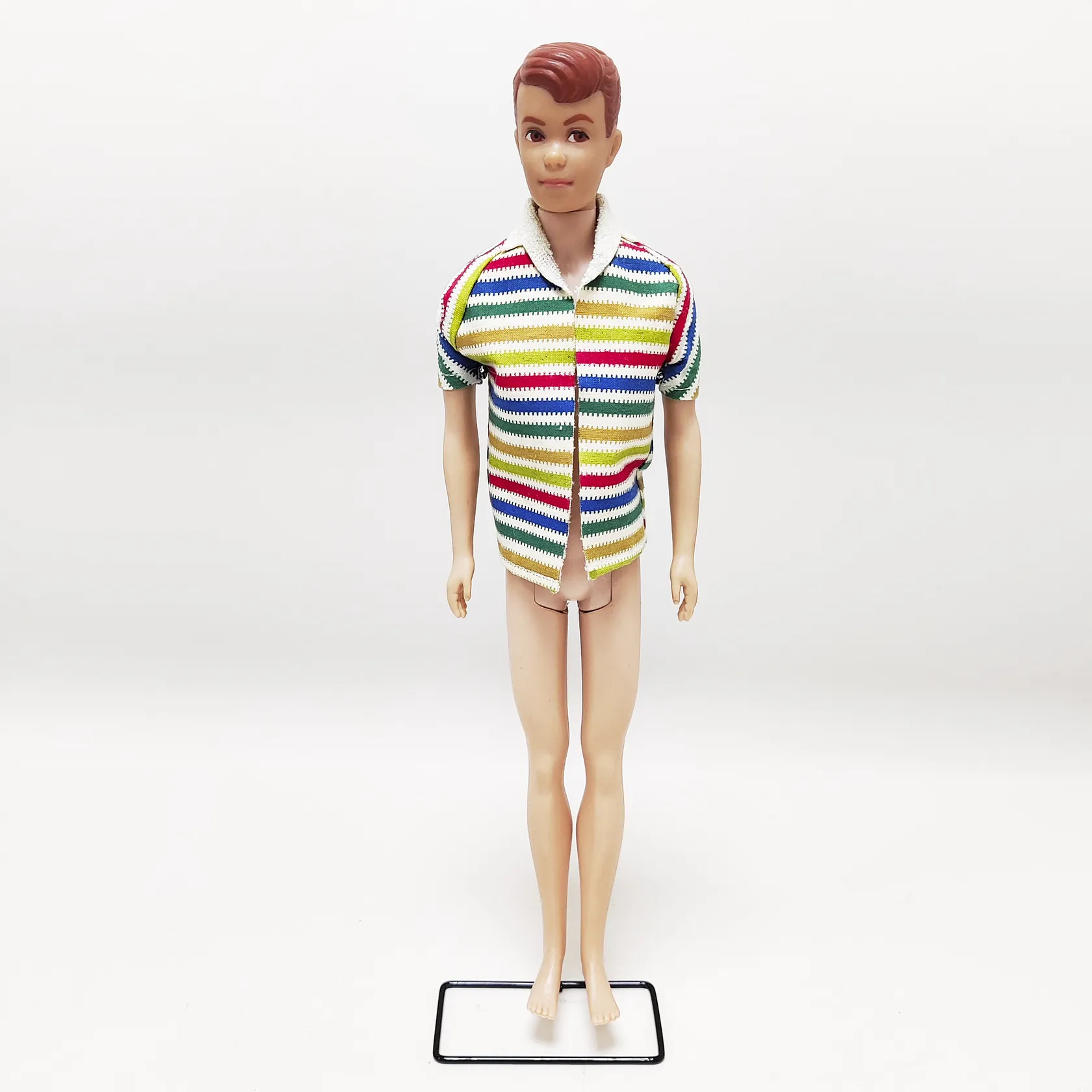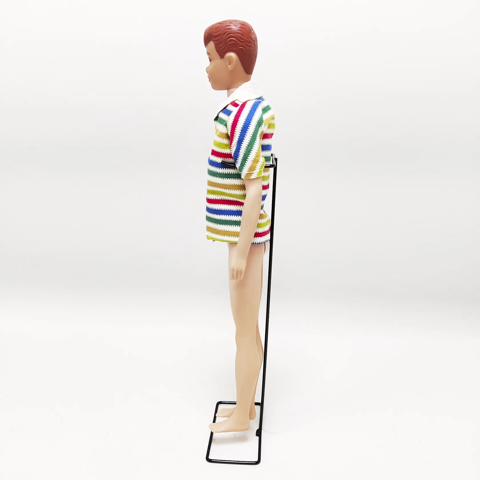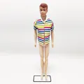 Barbiedocka, #1000 Allan, tillverkad år 1964, märkt "©1960 by Mattel Inc. Hawthorn Calif. U.S.A.", Kens kompis som delar kroppsform och märkning med Ken men har egen huvudform och kläder, denna Allan är endast klädd i strandjacka med horisontella ränder, han saknar blå bomullsshorts och korktofflor, inga övriga tillbehör.