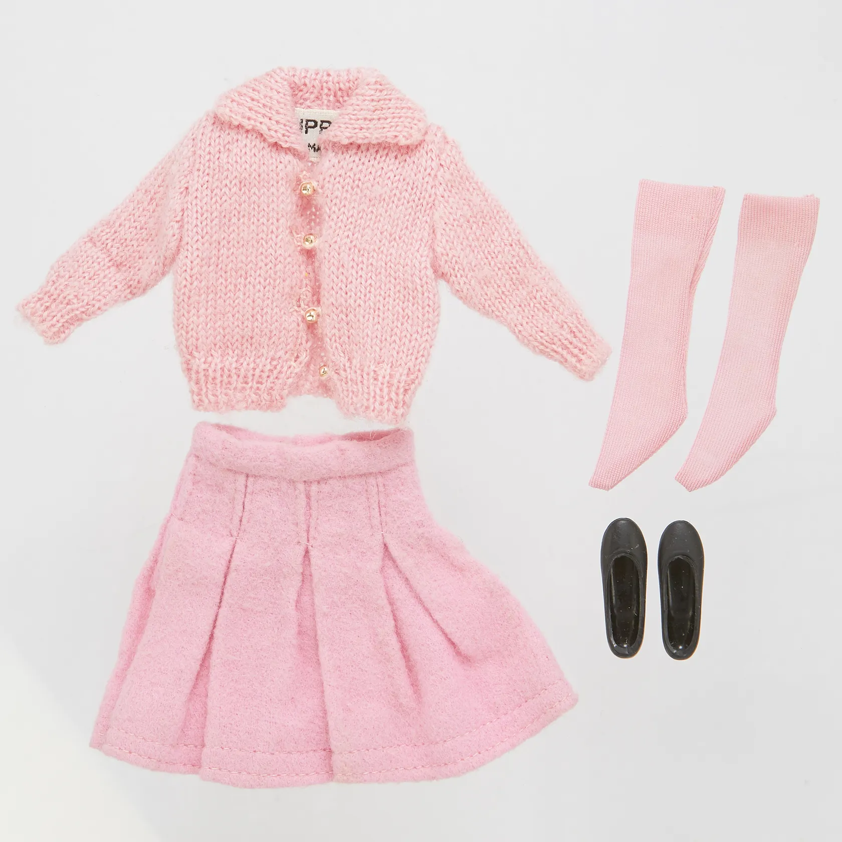 Barbiekläder, #1907 School Days, till Skipper, tillverkad 1964-1965, rosa stickad kofta, rosa strumpor, platta svarta skor, rosa flanellkjol, semikomplett (saknar vit bomullsblus, träskål med garnnystan).