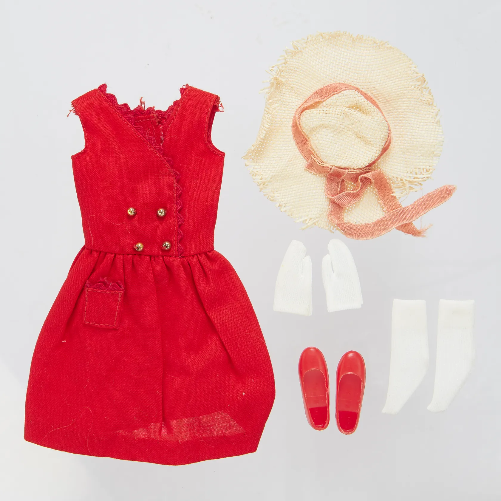 Barbiekläder, #1901 Skipper Red Sensation, tillverkad 1961-1964, komplett med röd klänning, vita handskar, vita ankelstrumpor, platta röda skor, stråhatt, bruksslitage.