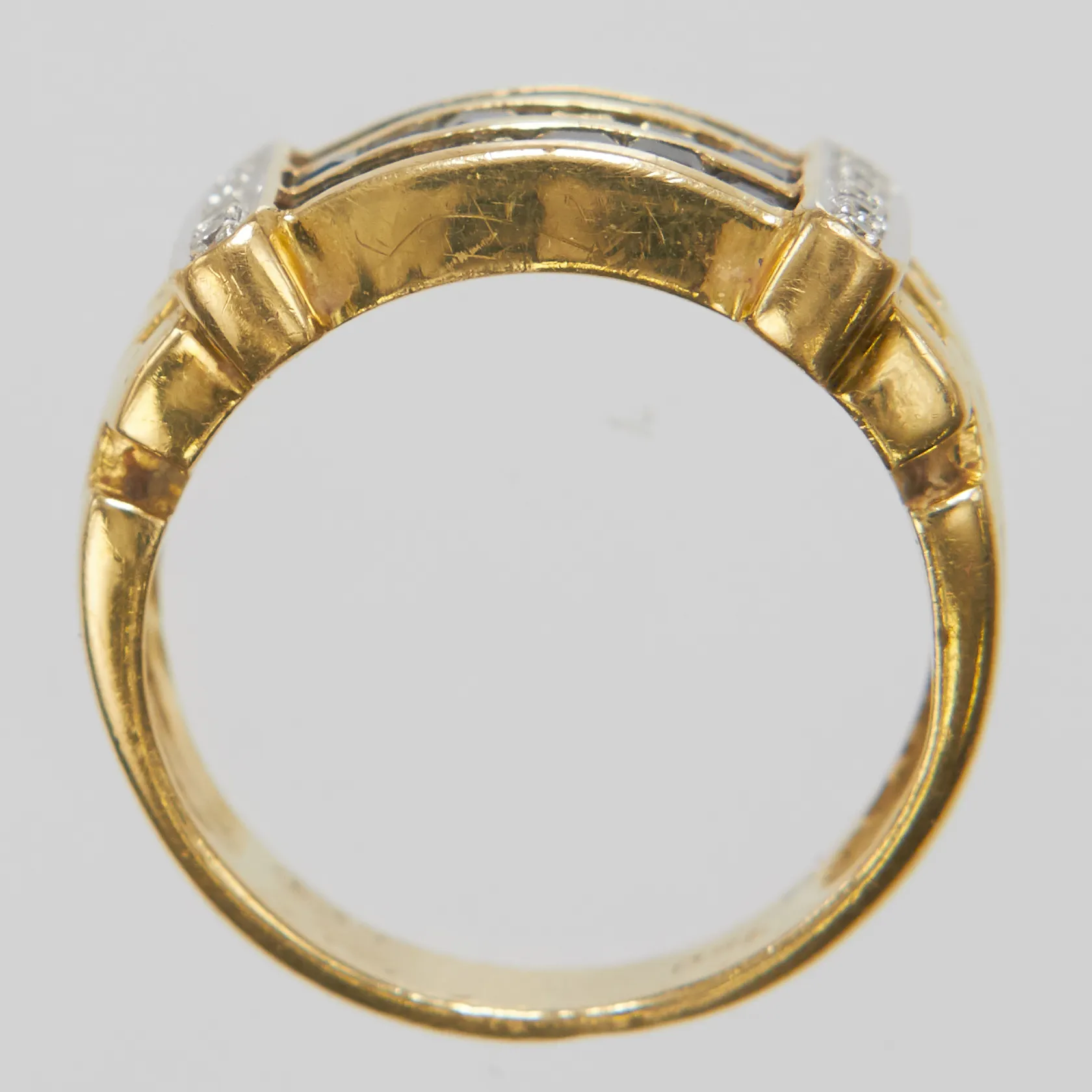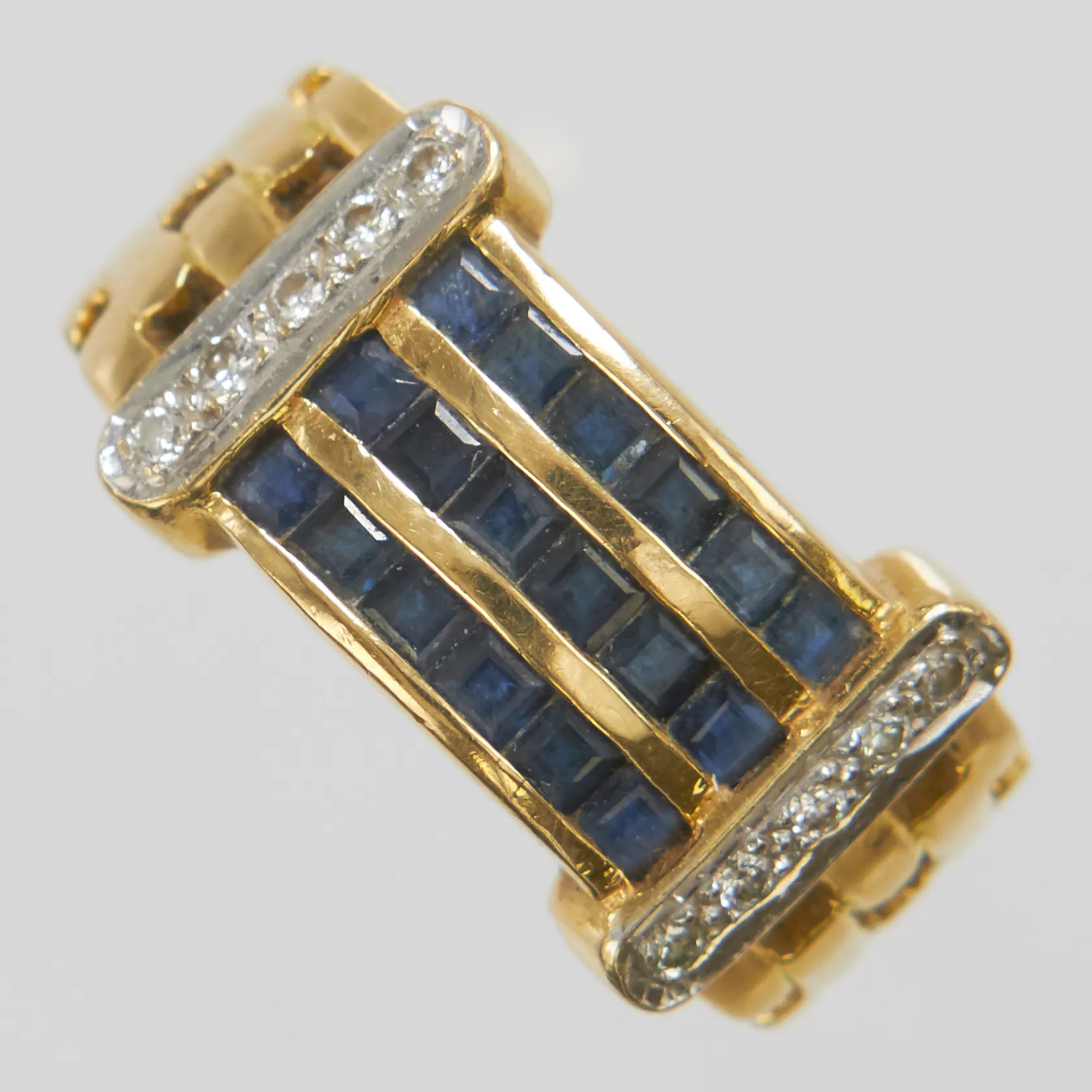 Ring med safirer samt diamanter 10 x ca.0,01ct, Ø17½, bredd: 5-10,7mm, 18K Vikt: 7,7 g.