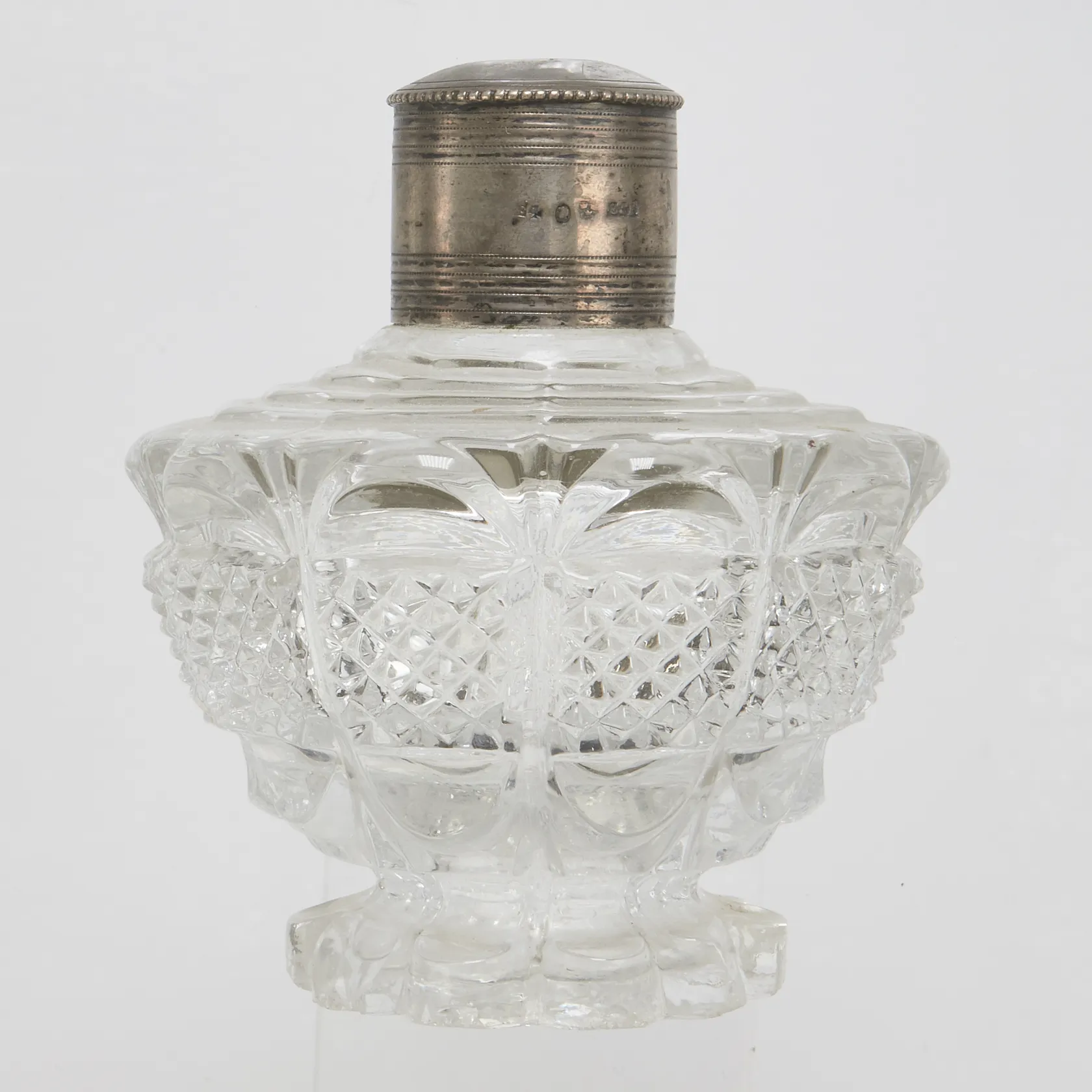 Oljelampa, Ø85mm, höjd:97mm, formpressat klarglas, naggad fot, lock i silver 830/1000.