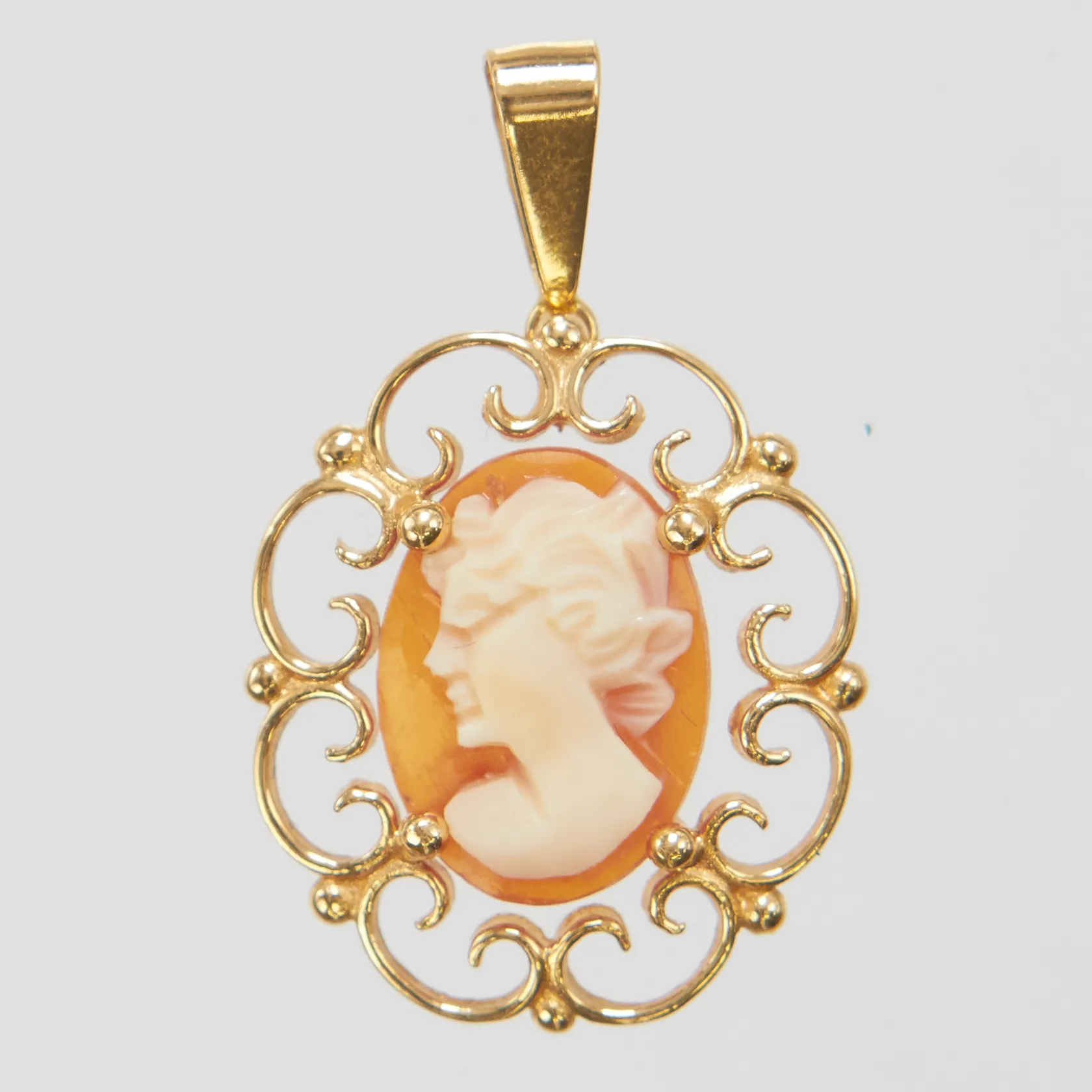 Hänge Camé, längd ca 30mm inkl ögla, bredd 18,5mm, 18K Vikt: 2,8 g.