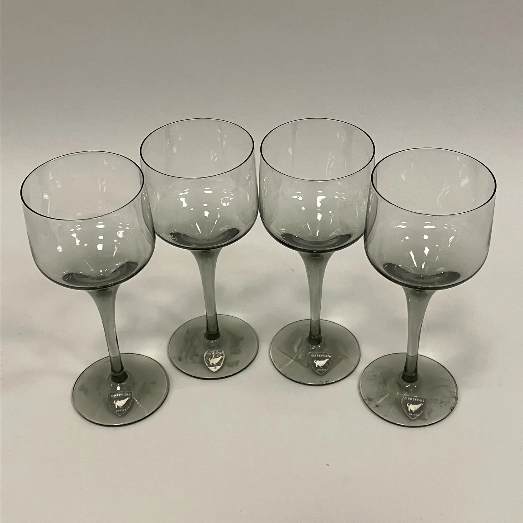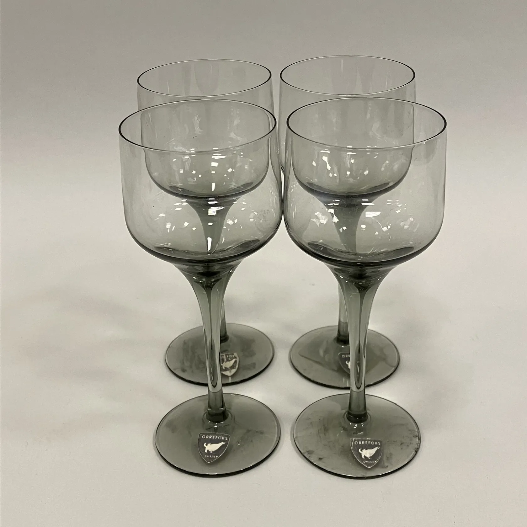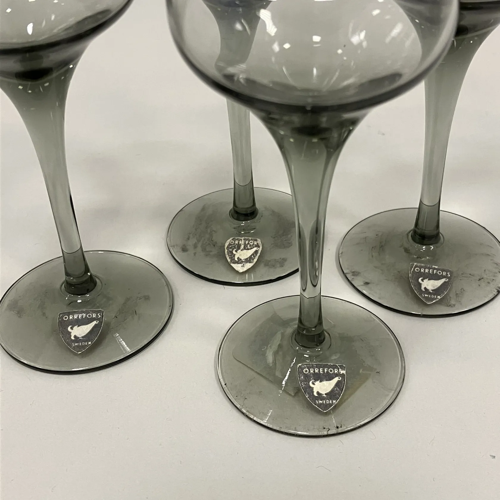 4 Sherryglas, Orrefors, grön/grå glas, höjd 12,5cm, äldre modell Skickas med postpaket.