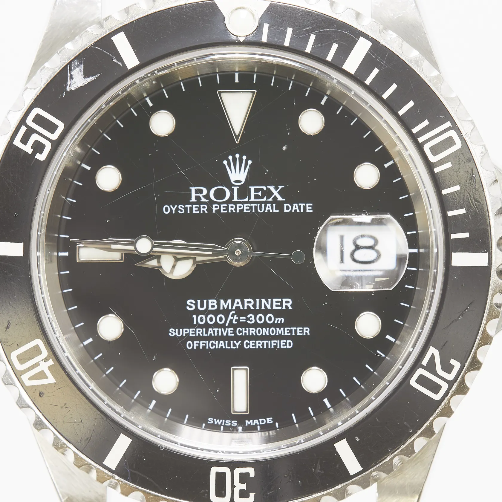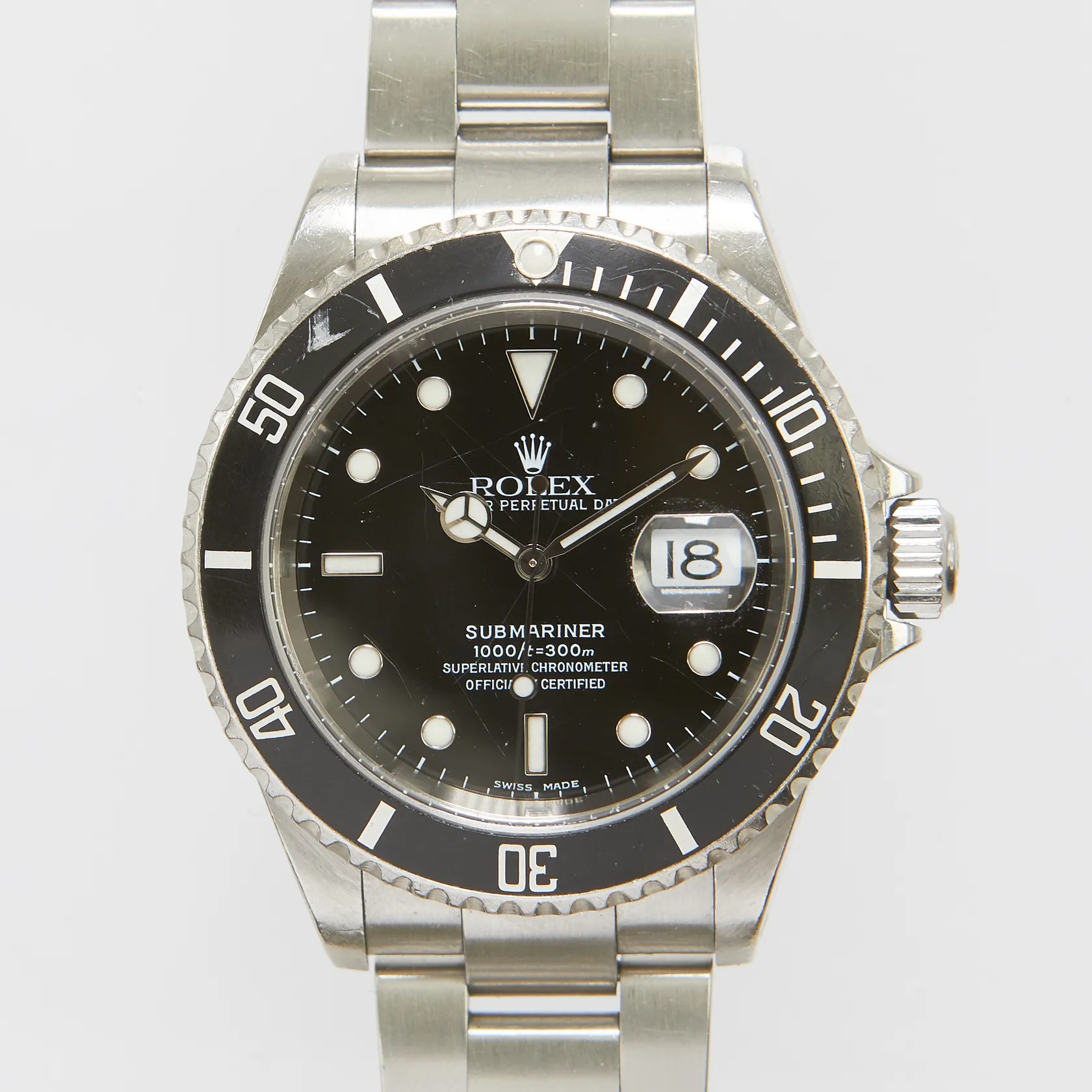 Herrur Rolex Submariner Date, stål, automatisk, 40mm, ref: 16610, snr: Y347364 ca 2002, Cal. 3135, verknr: 3 9618901, boettnr: 2160, repigt safirglas, datum, skadad dykring, oysterlänk, stål, ref: 93250-DT10, viklås, inga tillbehör.