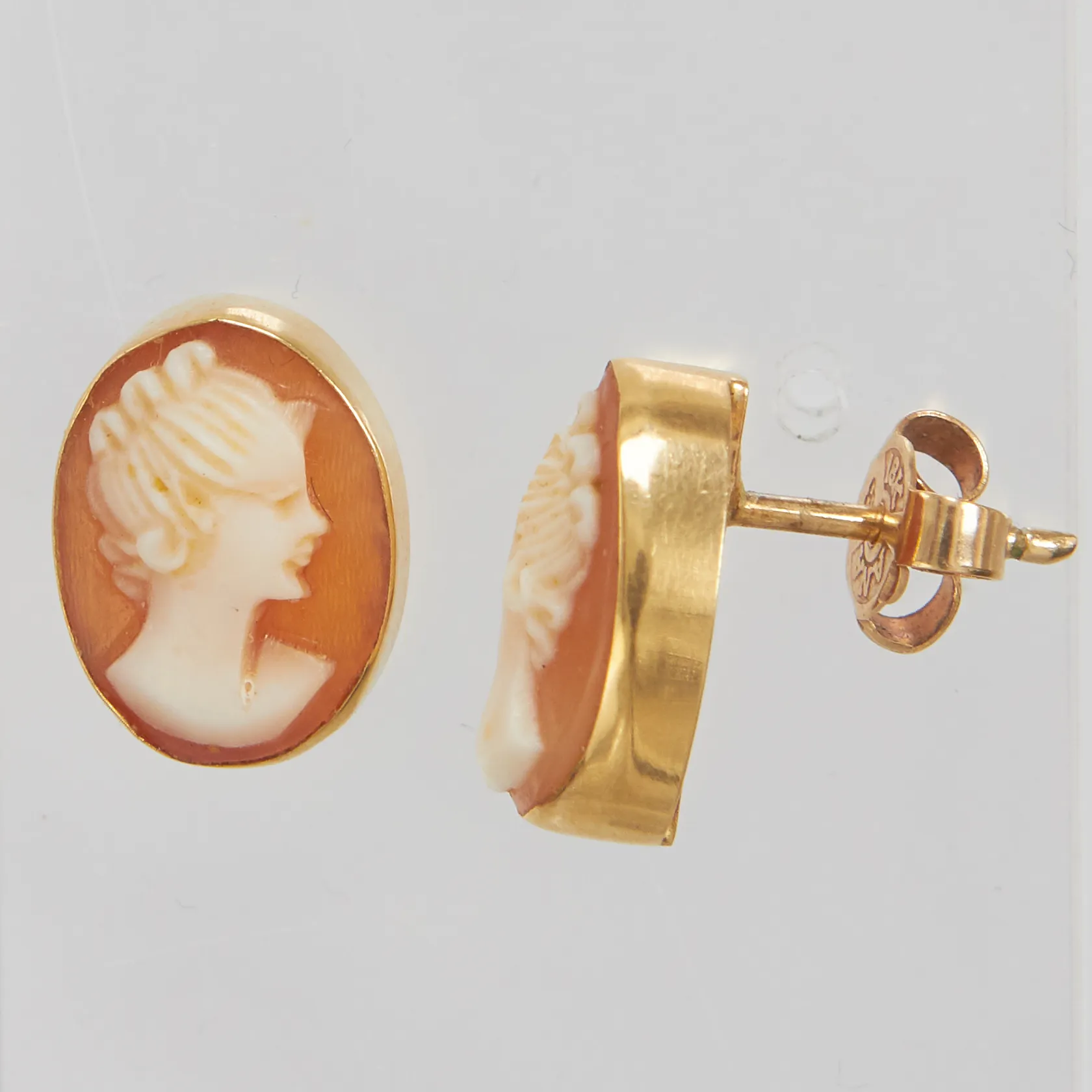 Örhängen med snäckskalskamé 12,5x9,5mm, omaka stoppar 18K. Vikt: 3,1 g.