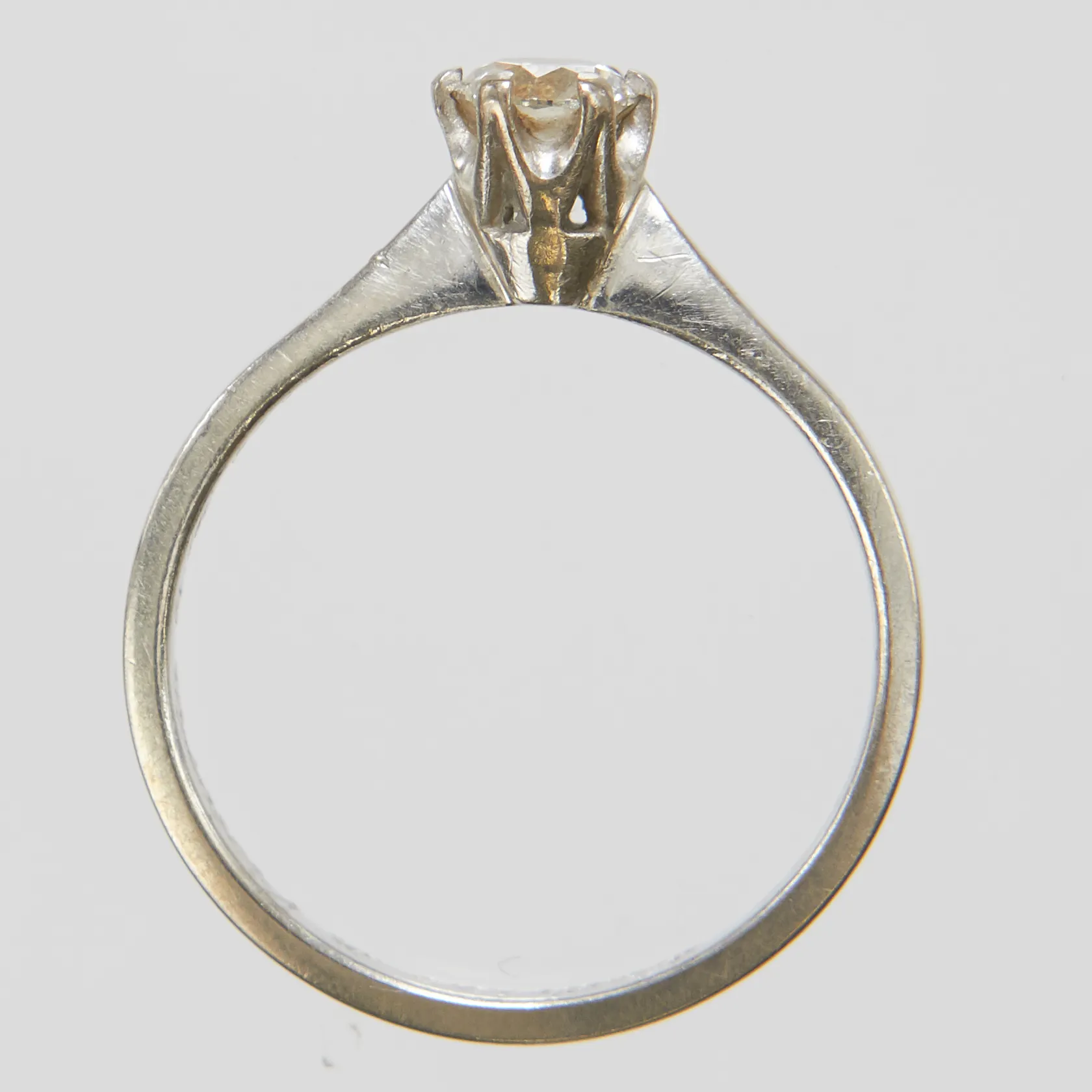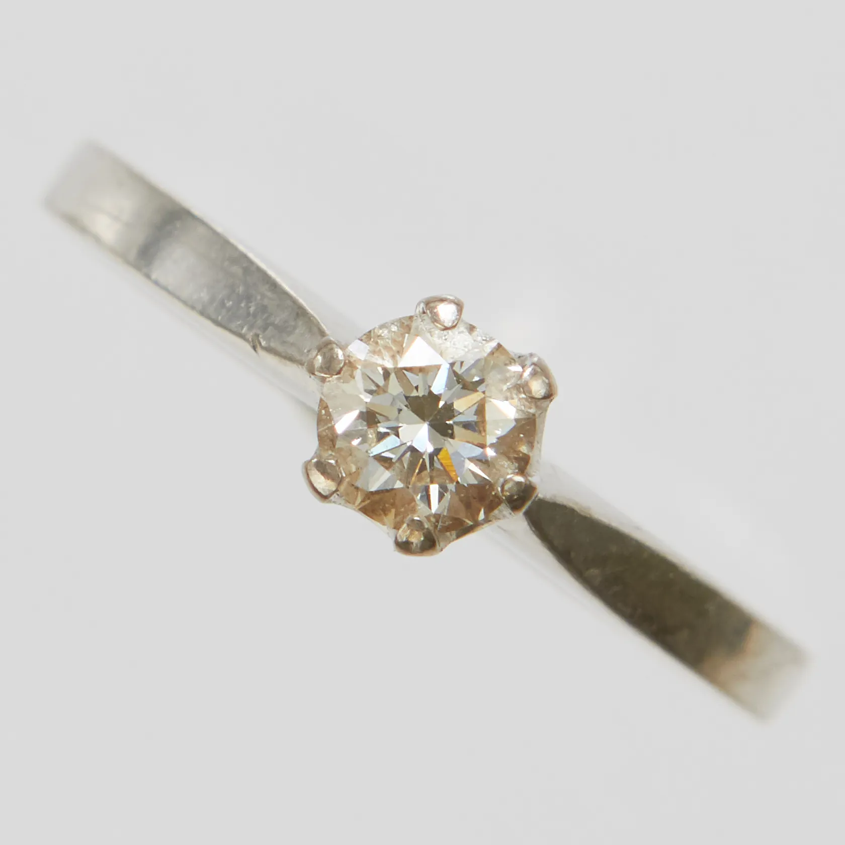 Ring med diamant 0,30ct enligt gravyr, ca.W(H)/VS-SI, stl 16¼, bredd 1,8-4,8mm, personlig gravyr, Schalins, repig skena, vitguld, 18K Vikt: 2,4 g.