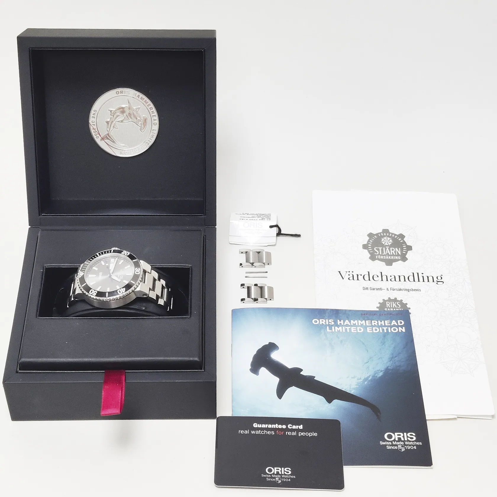 Herrur Oris Hammerhead, Limited edition nr 1091/2000, stål, automatisk, Ø 45,5mm, refnr: 01 752 7733 4183-set MB, serienr: 77331091, cal. 752, safirglas, datum, dag, stållänk, repig länk, extra länkbitar, viklås, garantikort samt kvitto Stjärnurmakarna 2018, servicebehov, box.