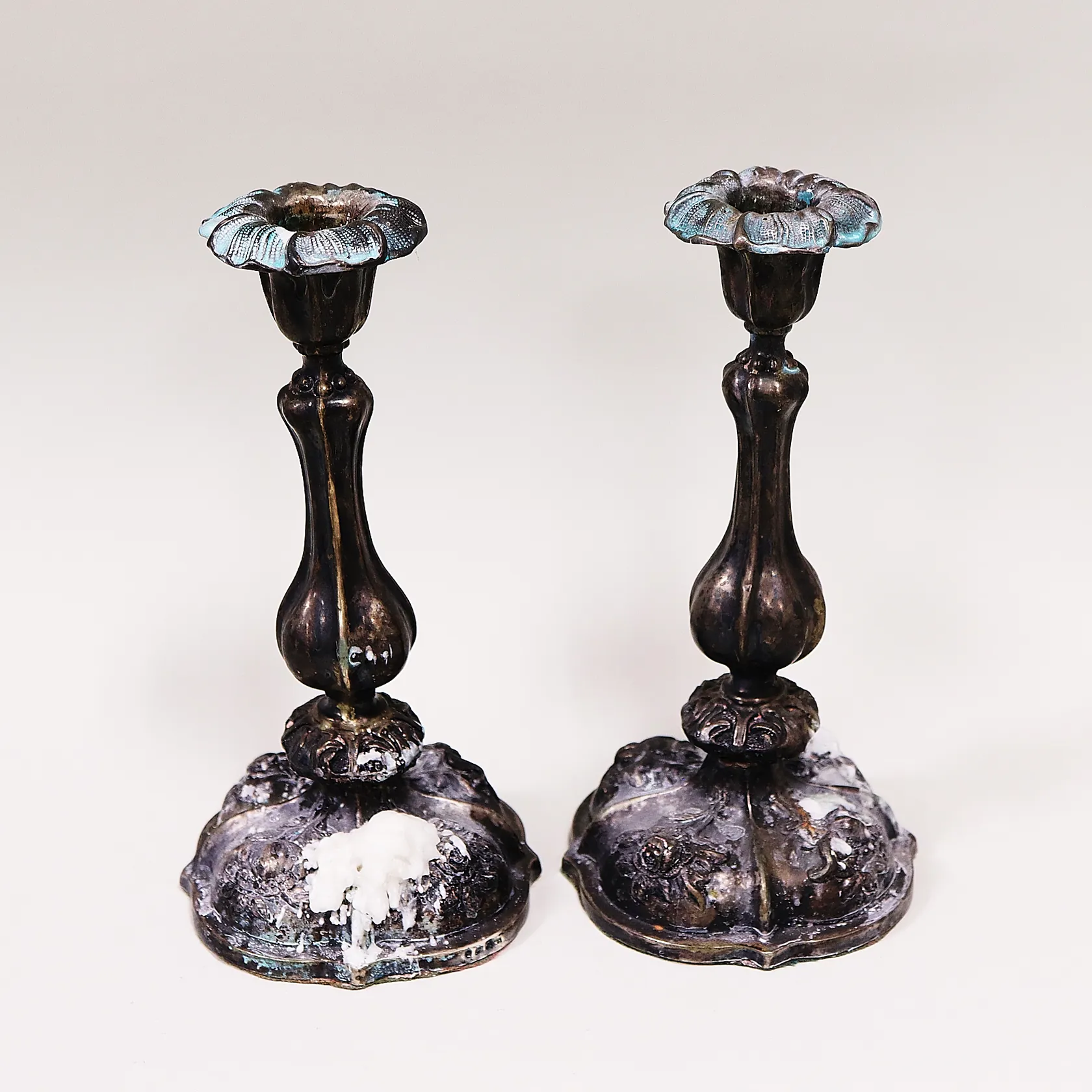Ett par ljusstakar 22cm, stearinrester, skevheter, fylld botten, defekter, bruttovikt silver 830/1000. Vikt: 833 g.