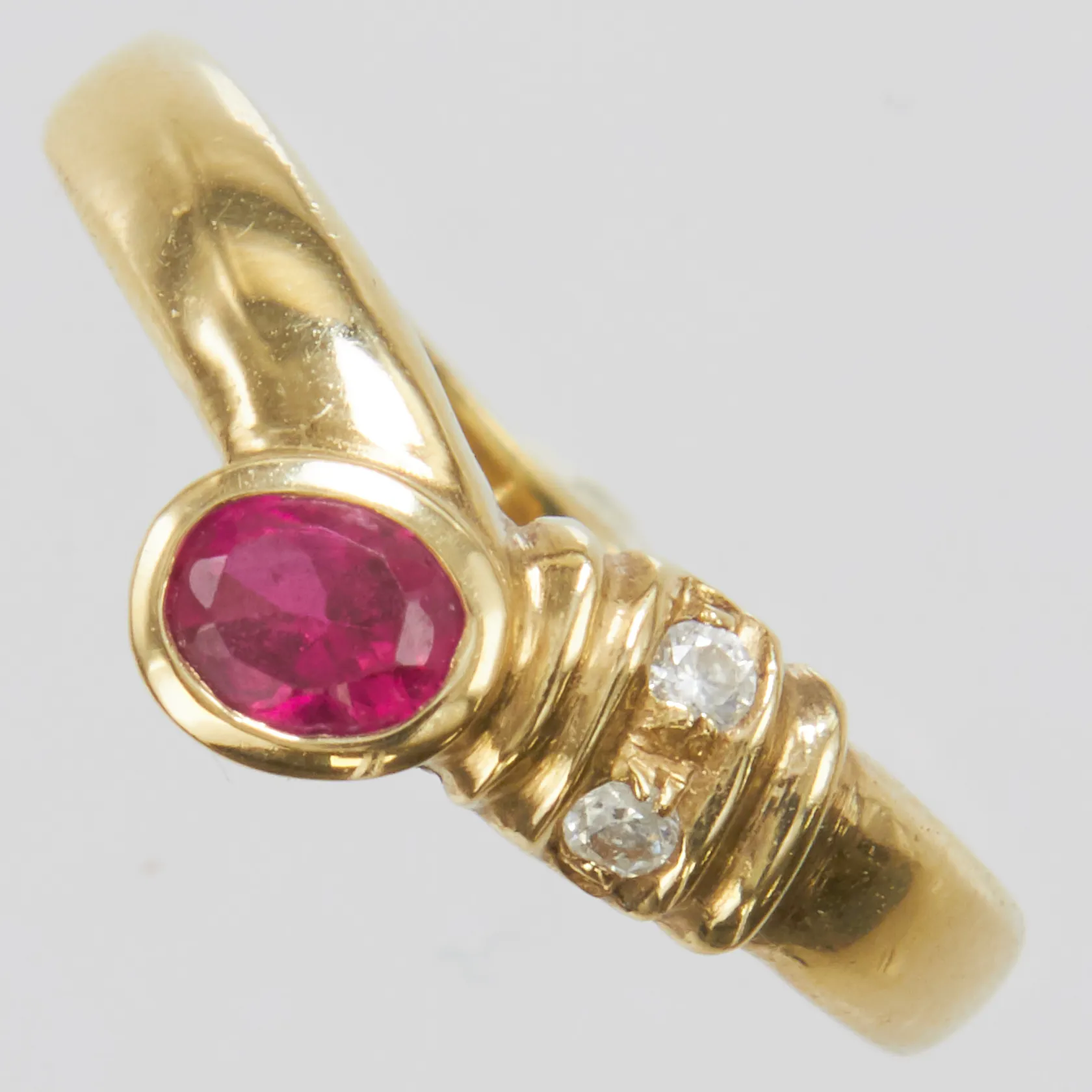 Ring, syntetisk rubin samt vita stenar, Ø17½, bredd: 2,1-7,1mm, 14K Vikt: 2,9 g.