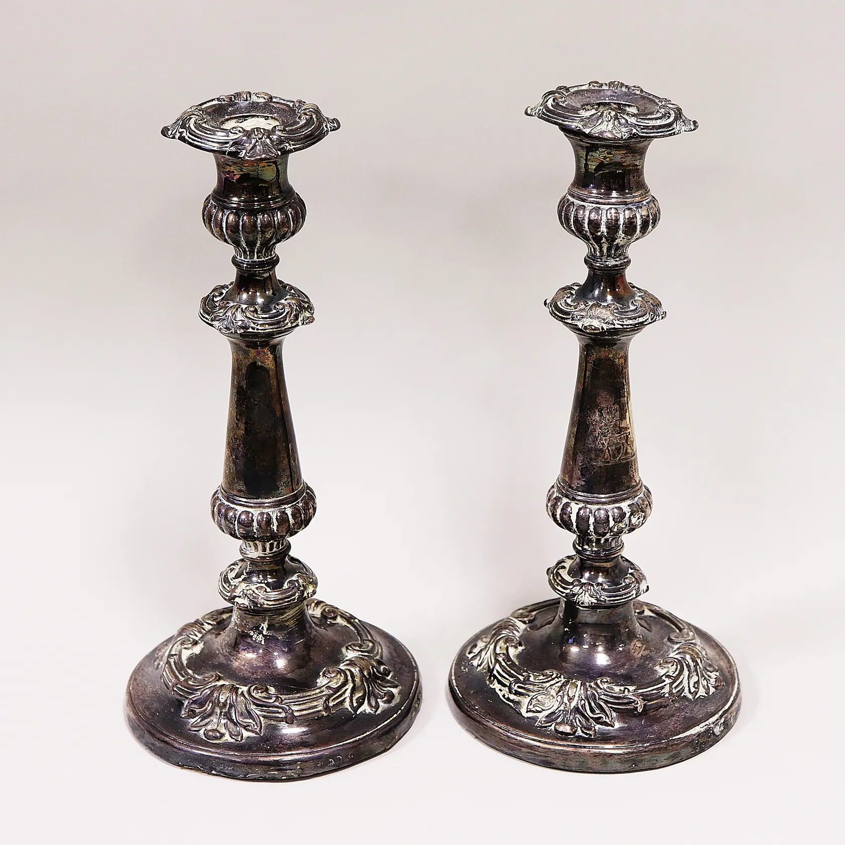 Ett par ljusstakar 28cm, stearinrester, skevheter, fylld botten, bruttovikt 1851g, otydliga stämplar, ursprung troligen England, silver 830/1000. Vikt: 1851 g.