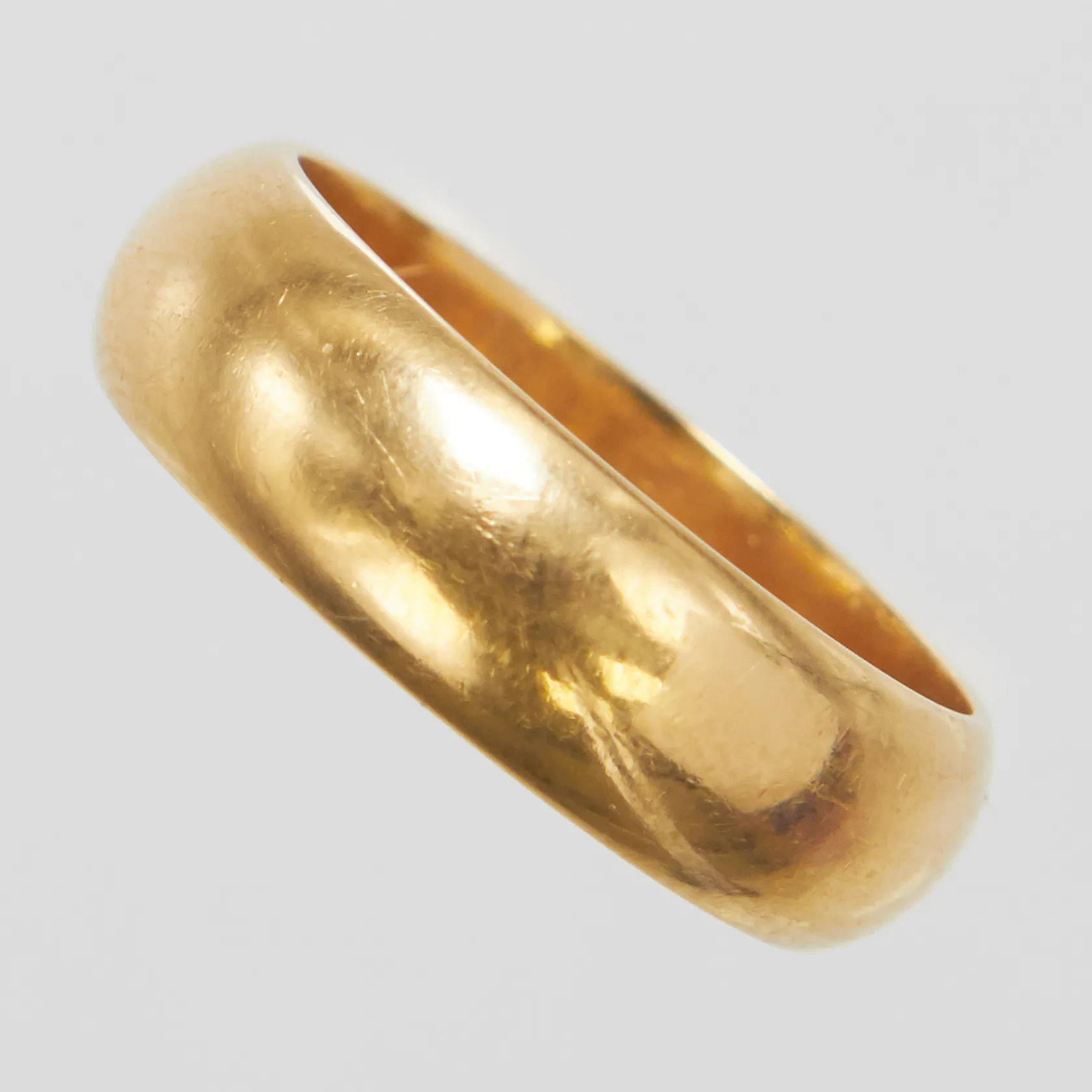 Ring slät, stl 16¼, bredd: 5,4mm, svenska stämplar, 18K Vikt: 5,8 g.