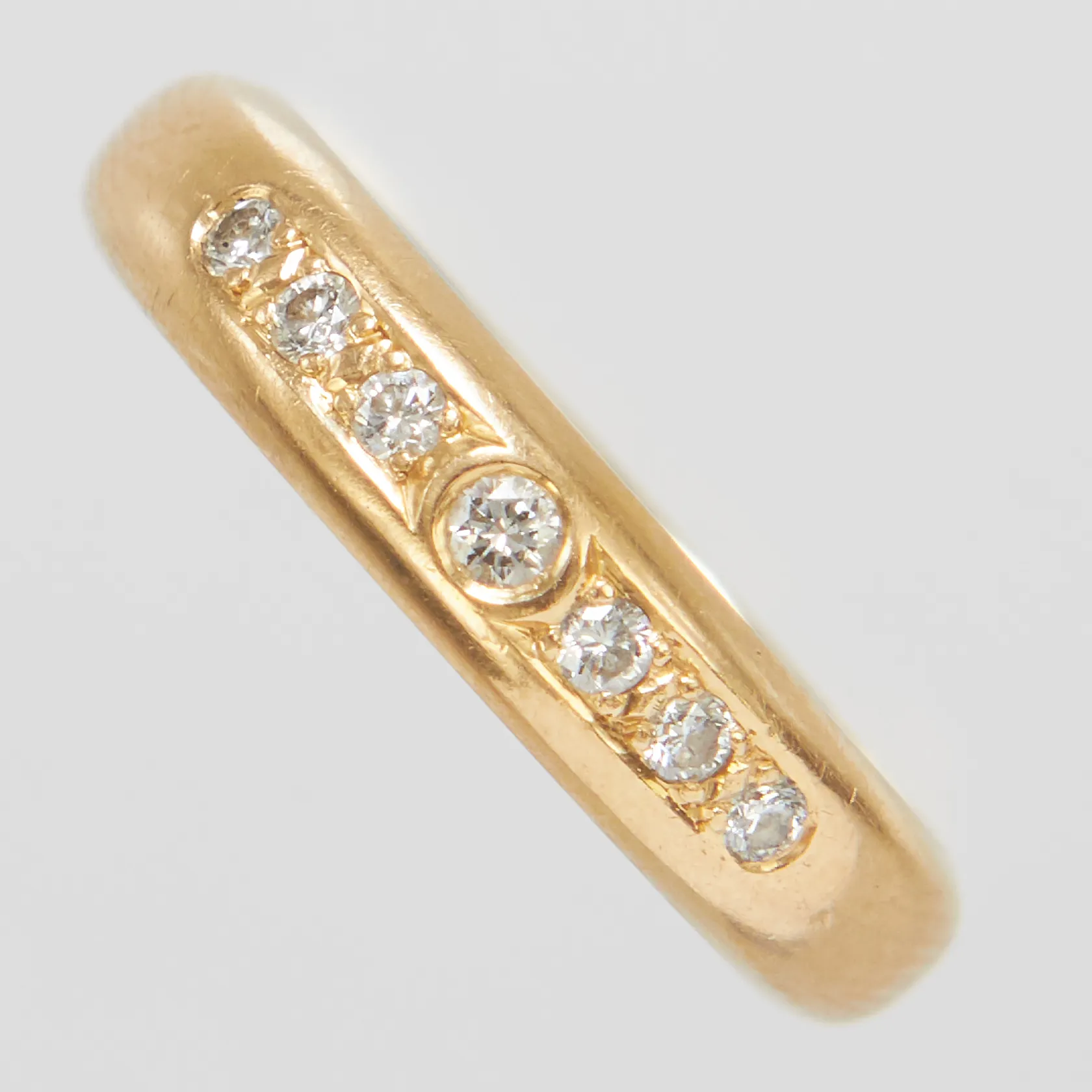 Ring, diamanter 7 x ca 0,02-0,03ct, stl 17, bredd 4,5mm, 18K Vikt: 6 g.