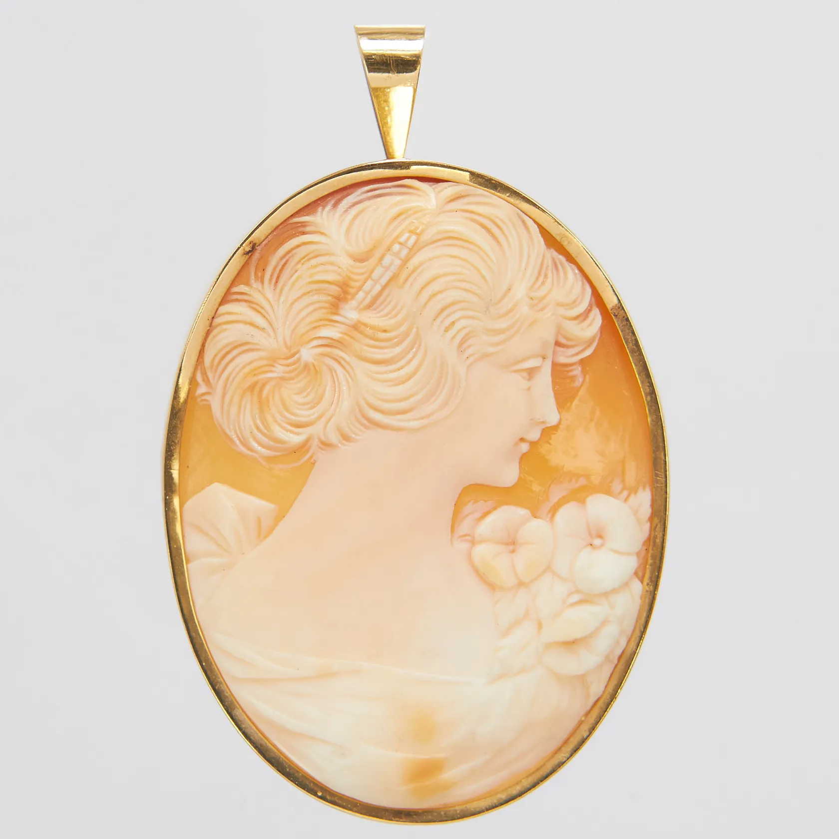 Hänge, snidad snäckskalskamé, 55,5x35,5mm, G.Dahlgren & Co, Malmö, 1932, tennlödningar på insidan av ramen, 18K, bruttovikt 10,5g Vikt: 10,5 g.