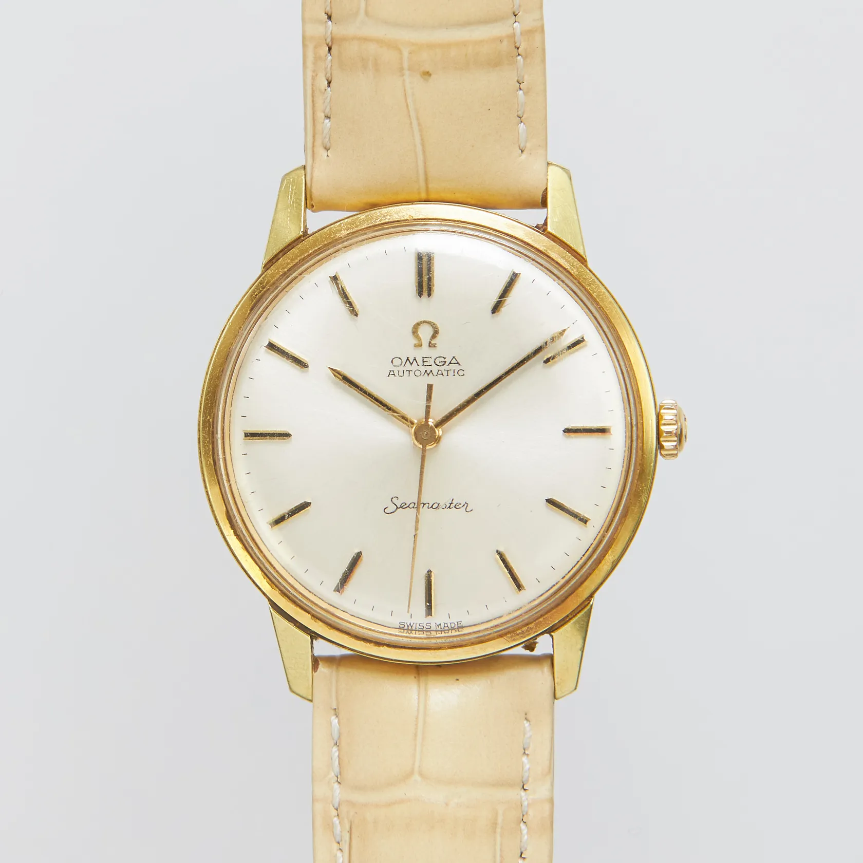 Herrur Omega Seamaster, doublé, automatisk, 34,3mm, boettnr: 165.002, Cal. 552, snr: 22983351, ca 1965, repigt glas, personlig gravyr daterad 1967, läderband samt bygelspänne ej original, inga tillbehör.