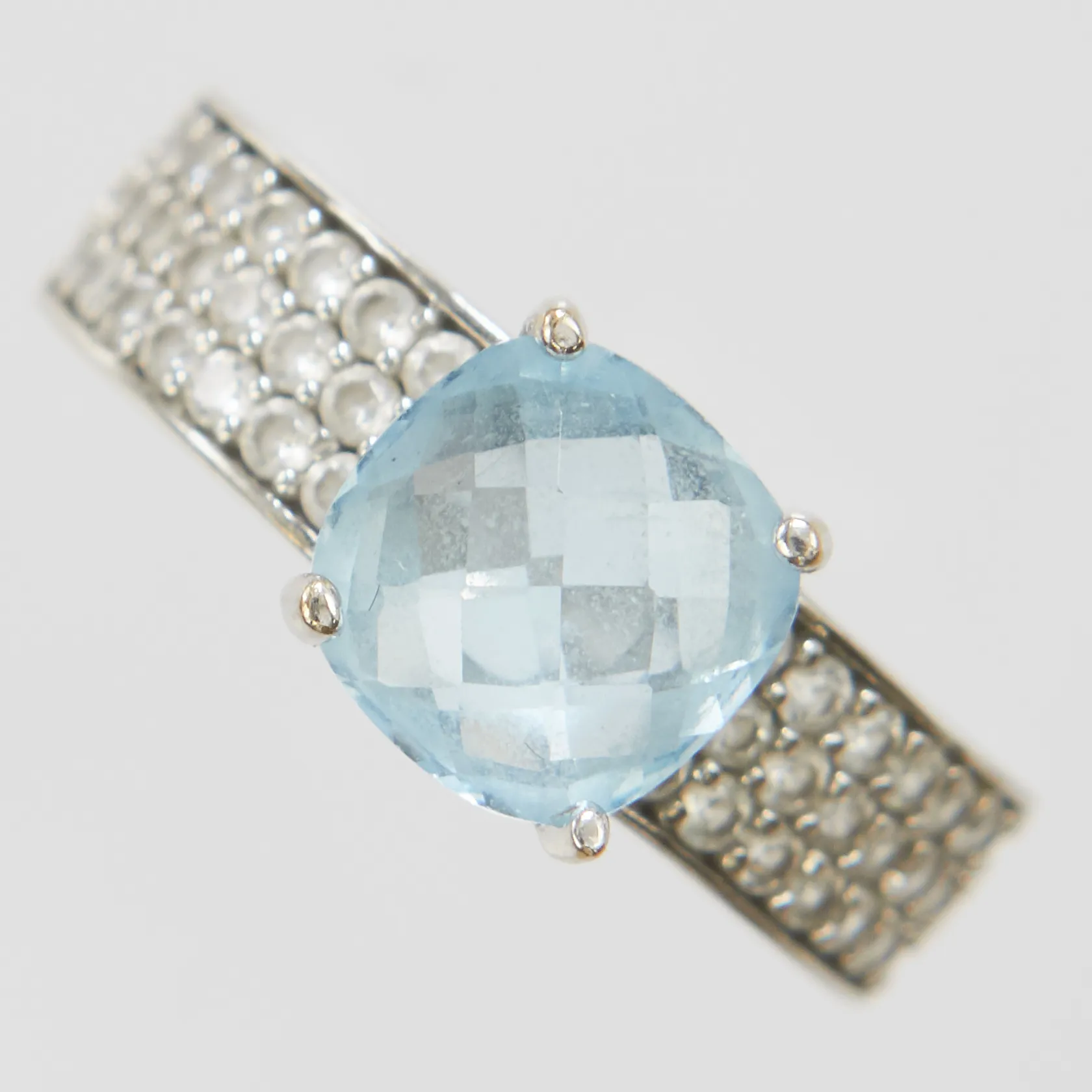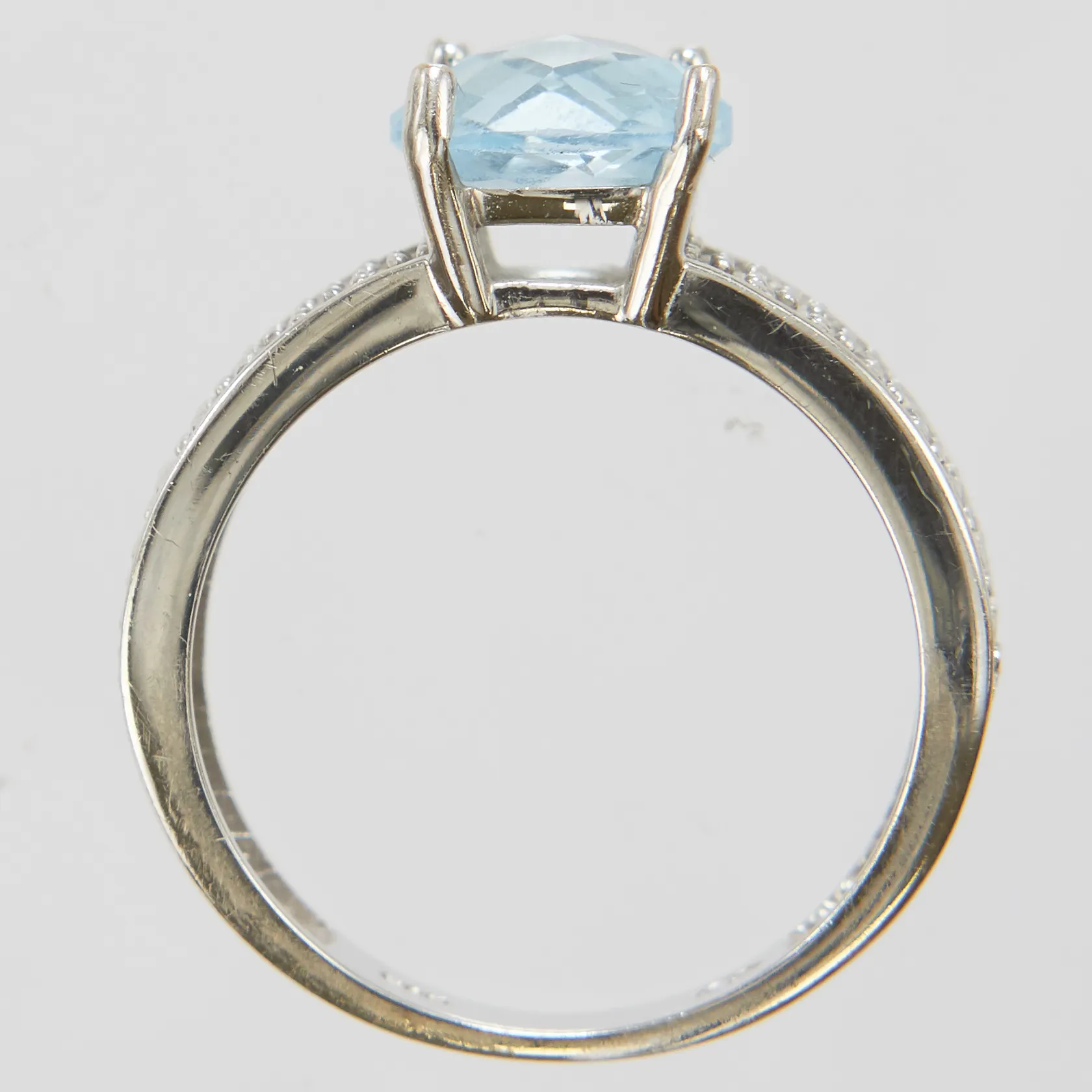Ring med blå topas samt vita stenar, stl 17, bredd 3-8mm, vitguld, 14K, bruttovikt: 4,0g Vikt: 4 g.