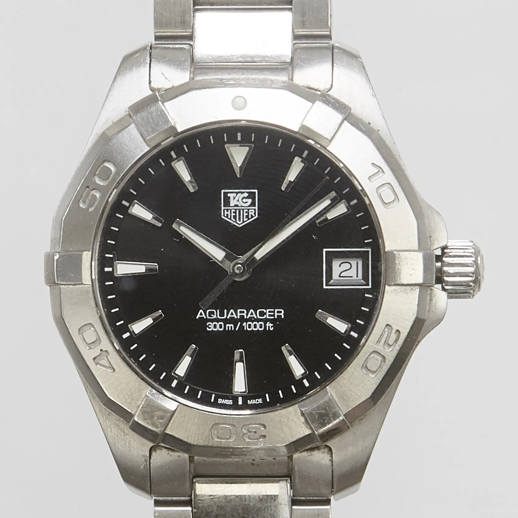 Damur Tag Heuer Aquaracer, stål, quartz, 32,5mm, ref: WAY1310, snr: RHT2698, safirglas, datum, stållänk, viklås, extra länkbit, repig, box, ytterkartong, inga övriga tillbehör.
