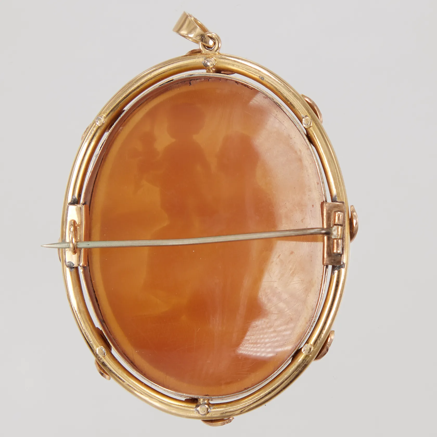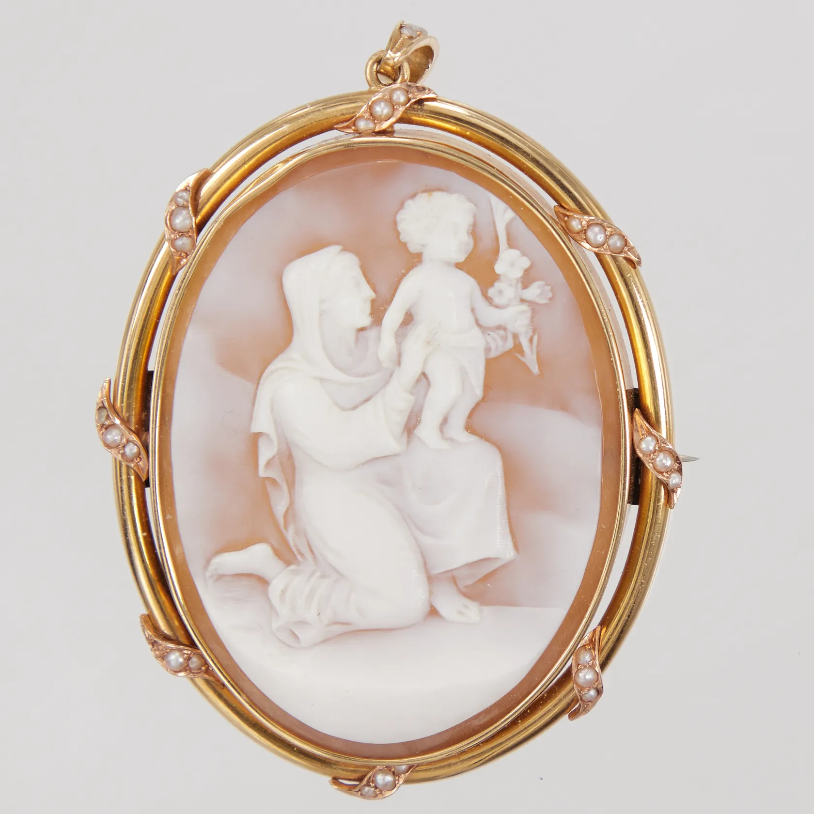 Hänge/brosch, ca 40x60mm, camé kvinna och barn, små pärlfrön, 1 pärla saknas, nål oädel, KAA år 1922, 18K Vikt: 13,6 g.