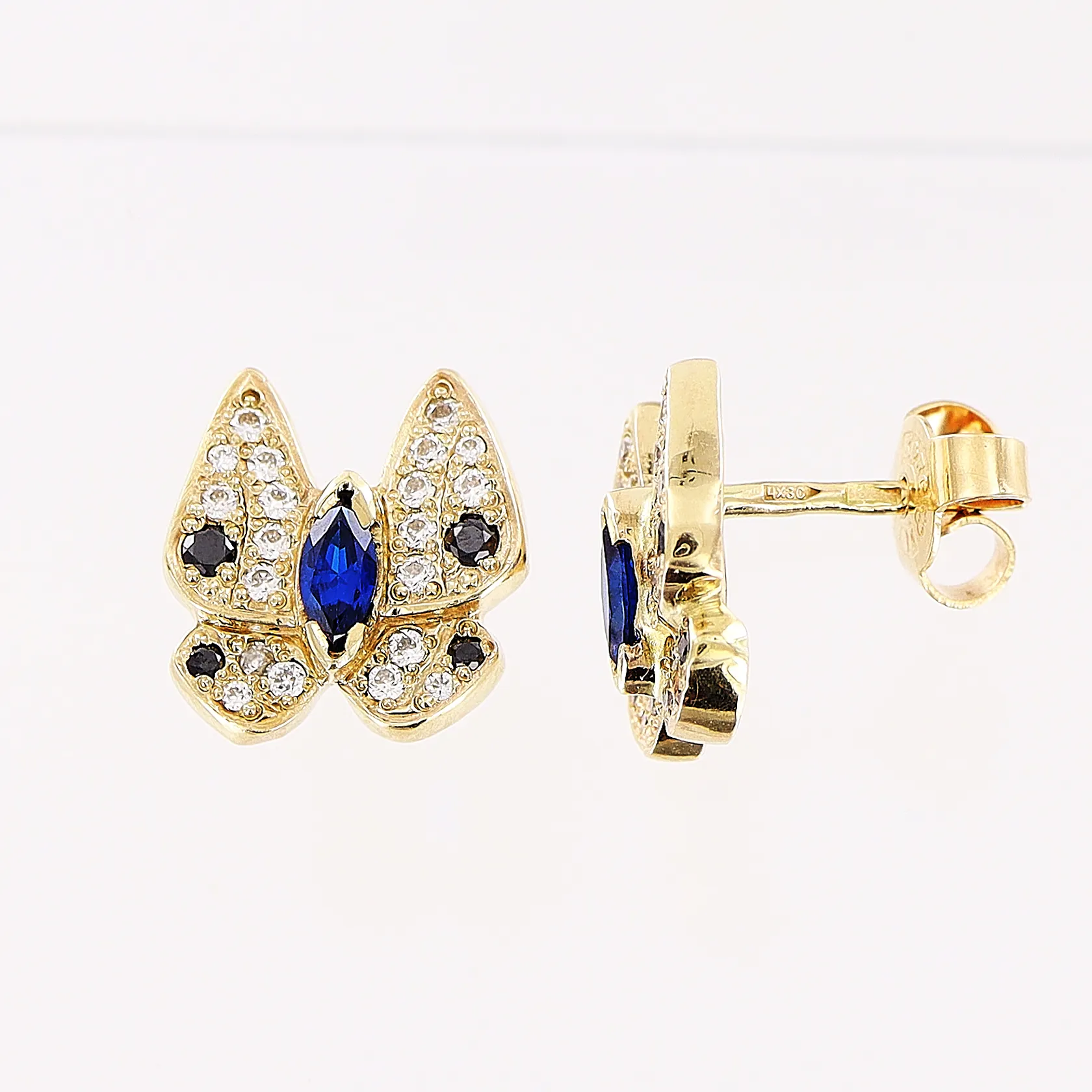 Ett par örhänge, fjäril, vita/blå stenar, 12x12mm, stoppar i 18K, örhänge i 14K. Vikt: 5 g.