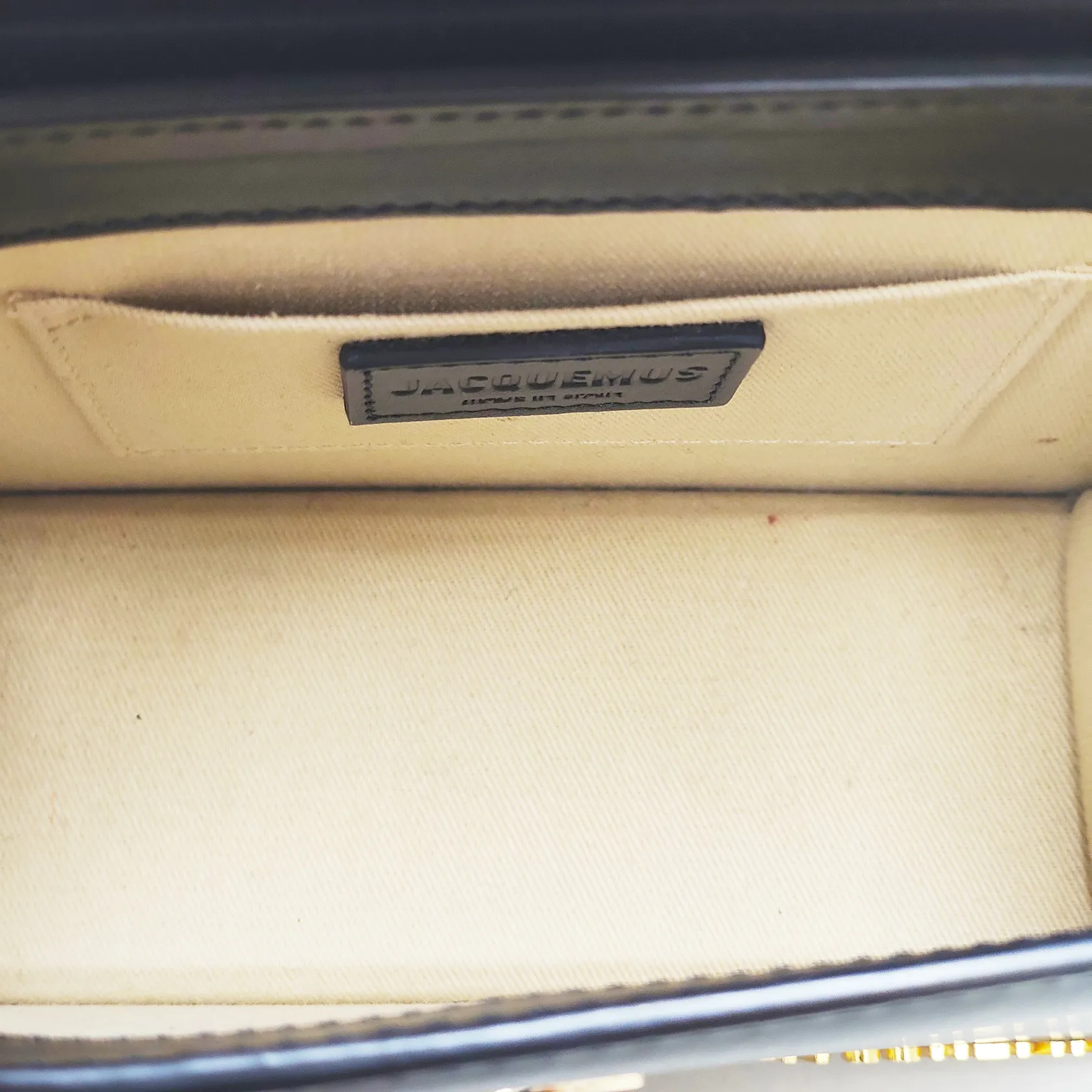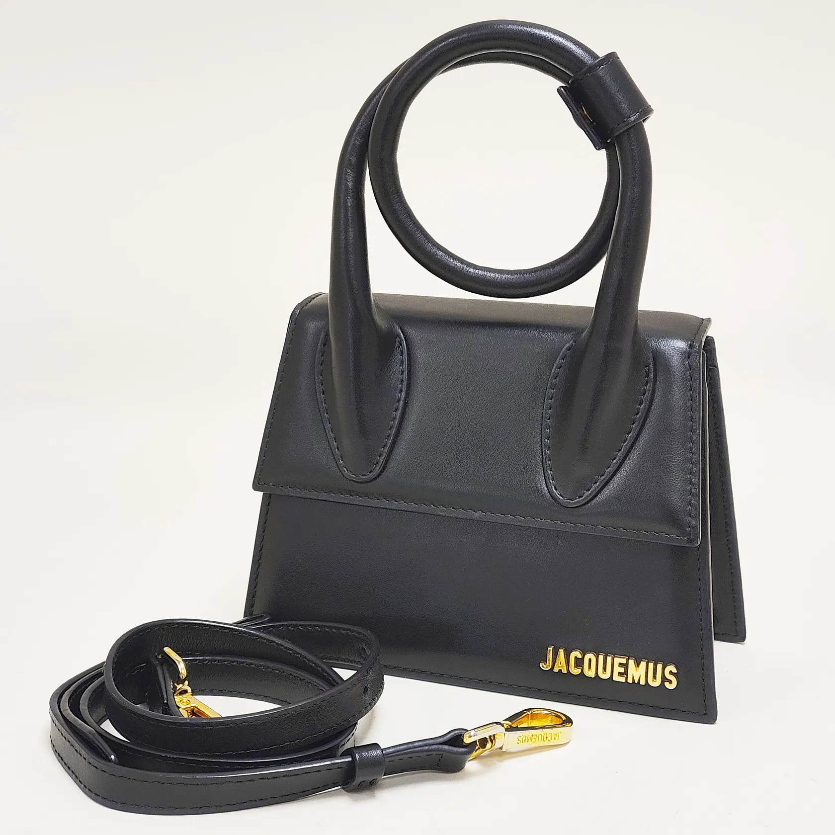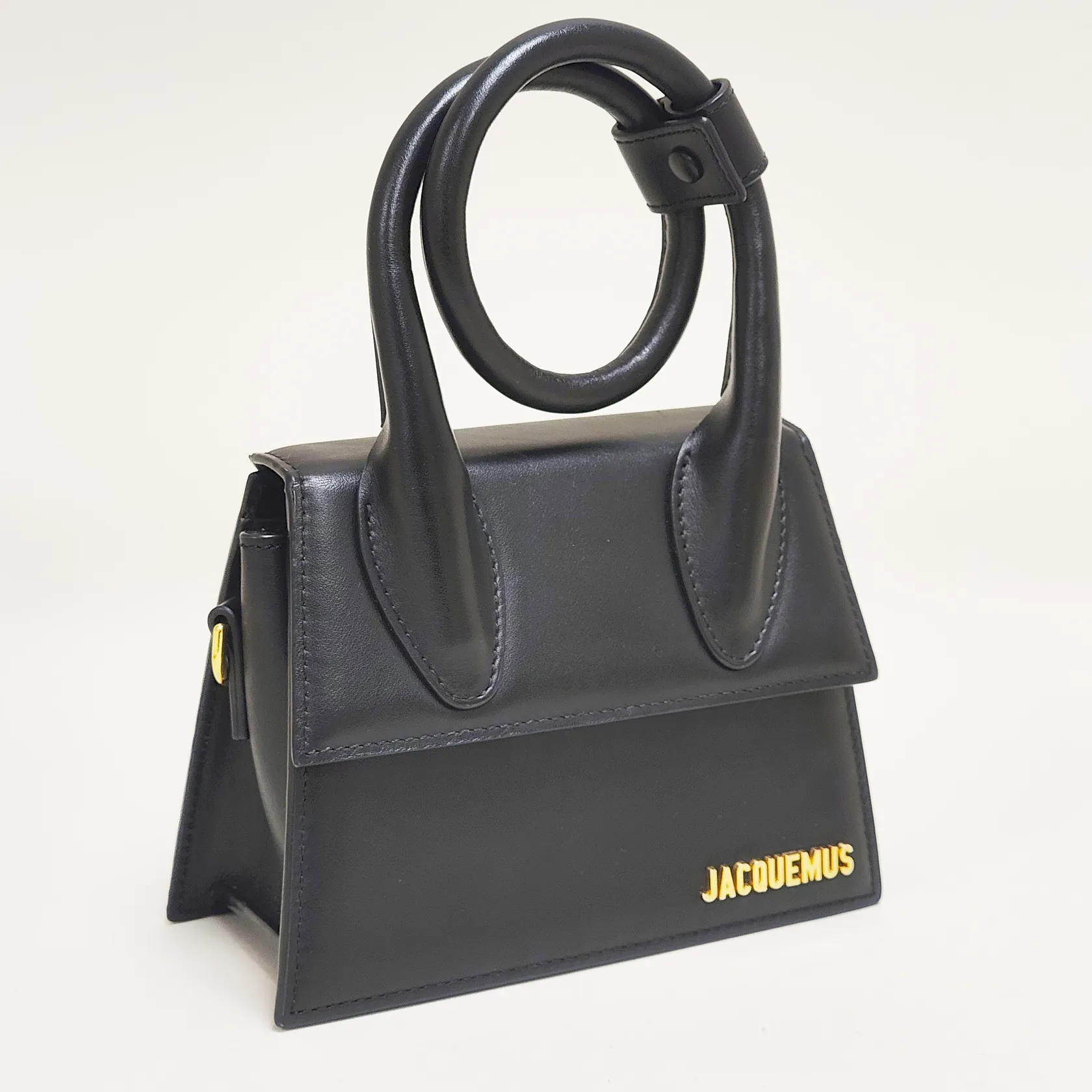 Väska Jacquemus Le Chiquito Noeud totebag, svart läder, beslag i gulmetall, mått 18x13,5x6cm, innerfack för kort, avtagbar axelrem, invändiga fläckar, dustbag, inga andra tillbehör.