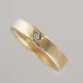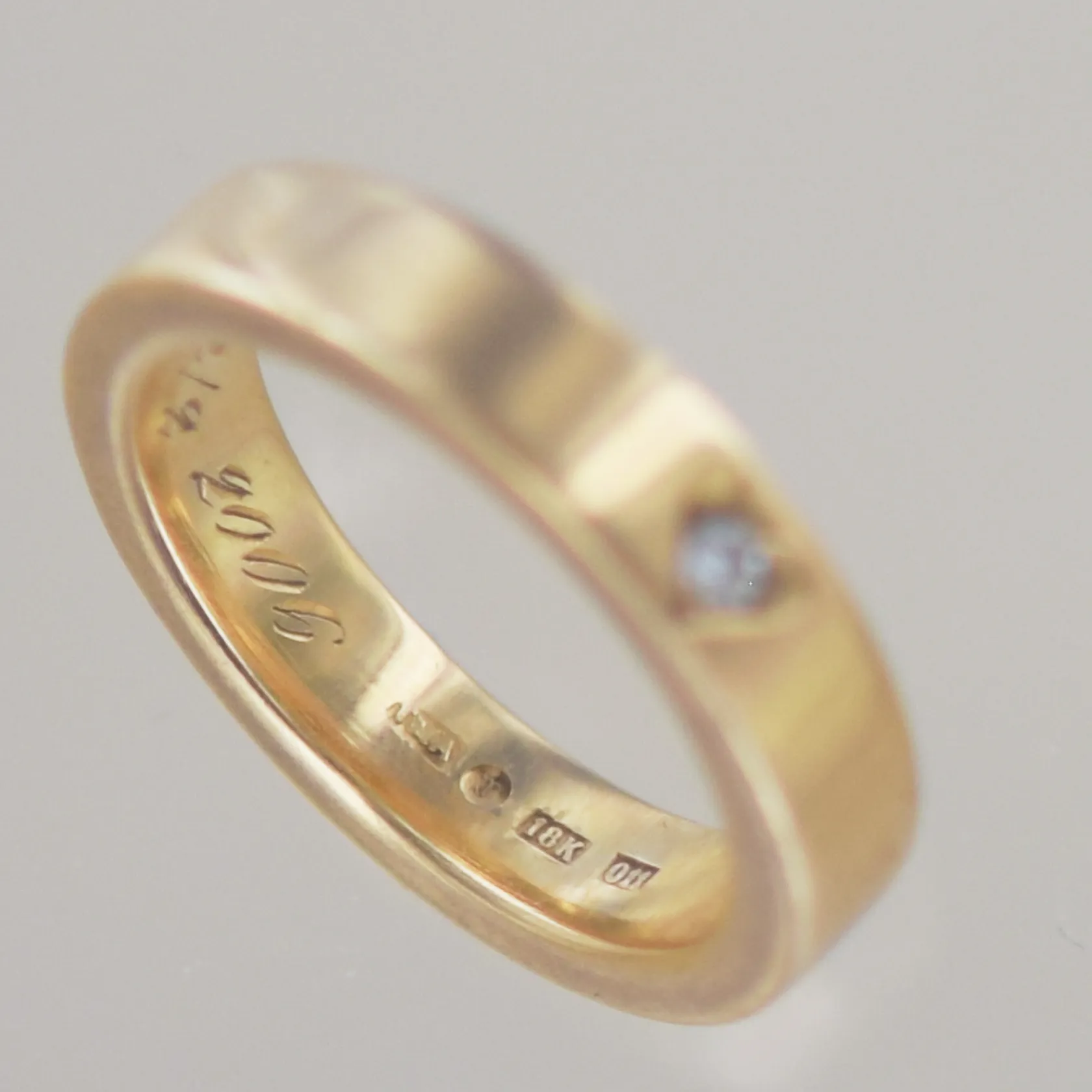 Ring design Tomas Martinsson med 0,03ct diamant,Ø 17,25 mm bredd 4,4 mm, 18k graverad Vikt: 9,2 g.