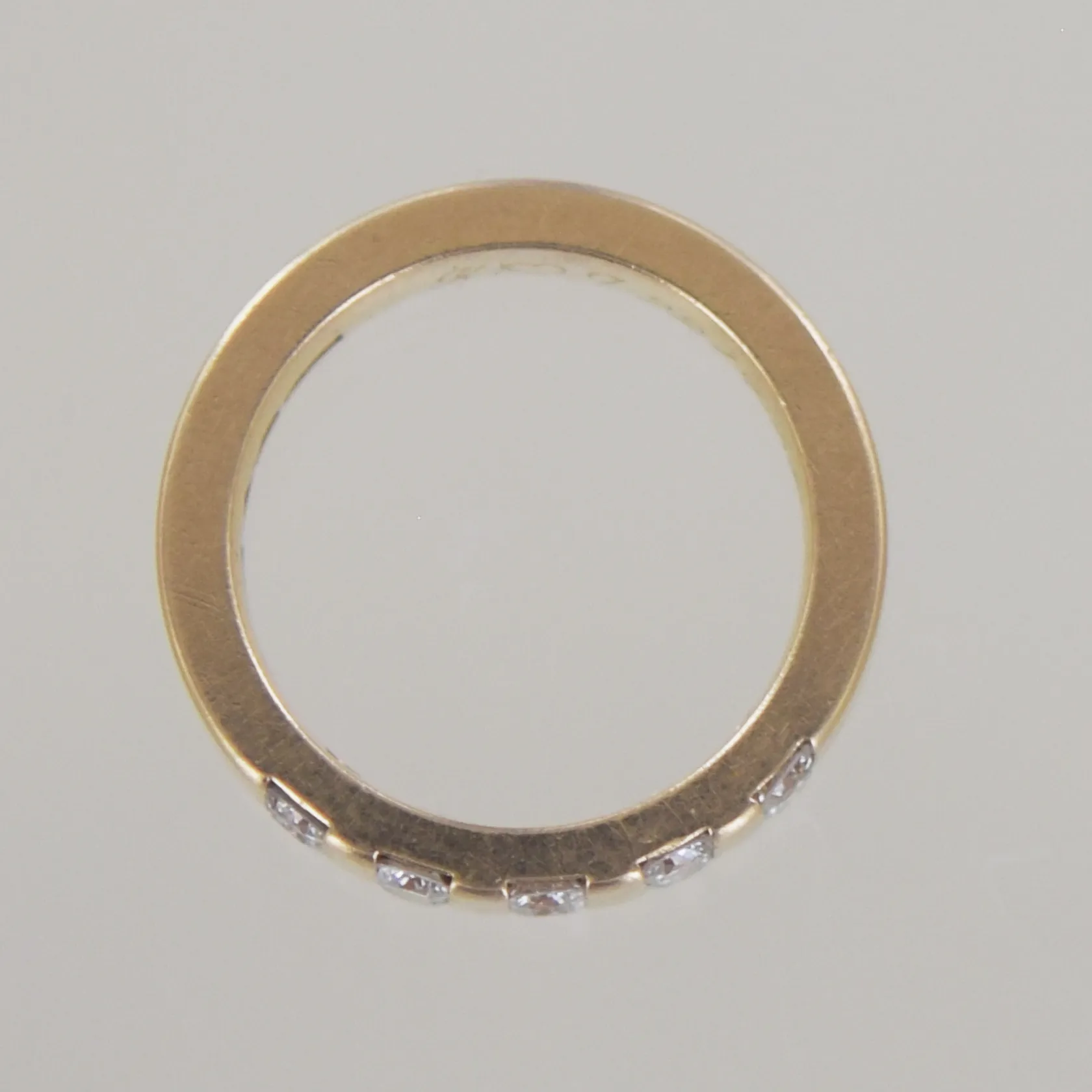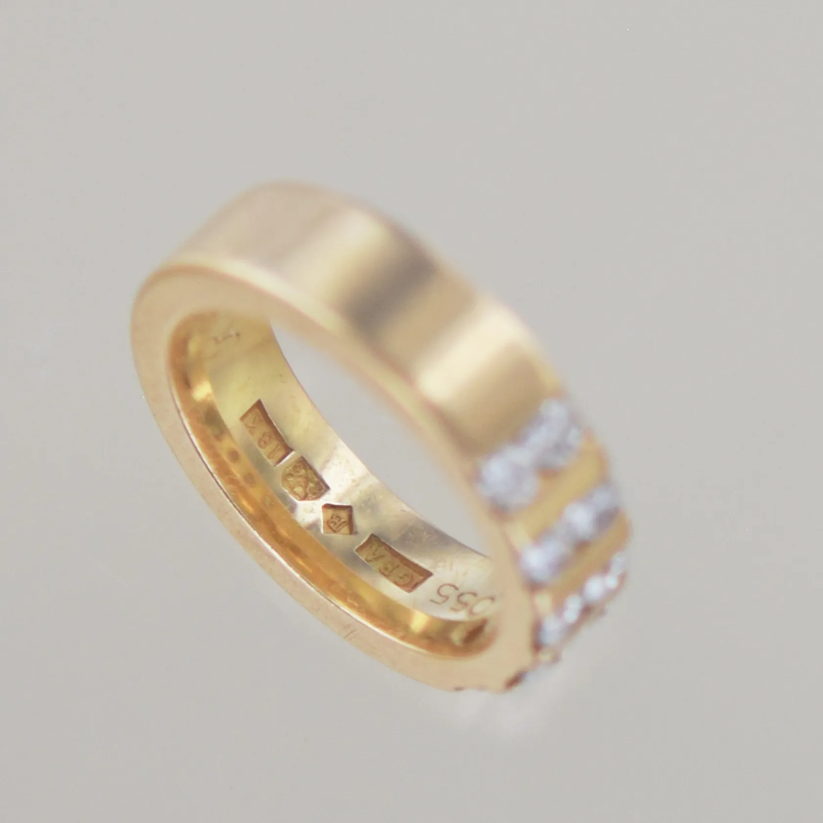 Ring med 10 diamanter totalt 0,55ct, Ø 15,5mm B 5 mm, 18k graverad Vikt: 8,2 g.