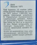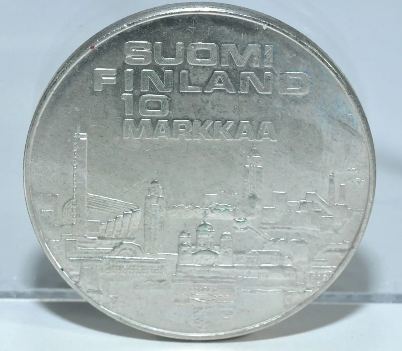 Jubileumsmynt EM Friidrott Helsingfors 1971, 10 Mark, Ø 35mm 925/1000 ligger i blå plastficka med intyg -beskrivning på svenska och finska Vikt: 24 g.
