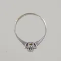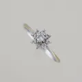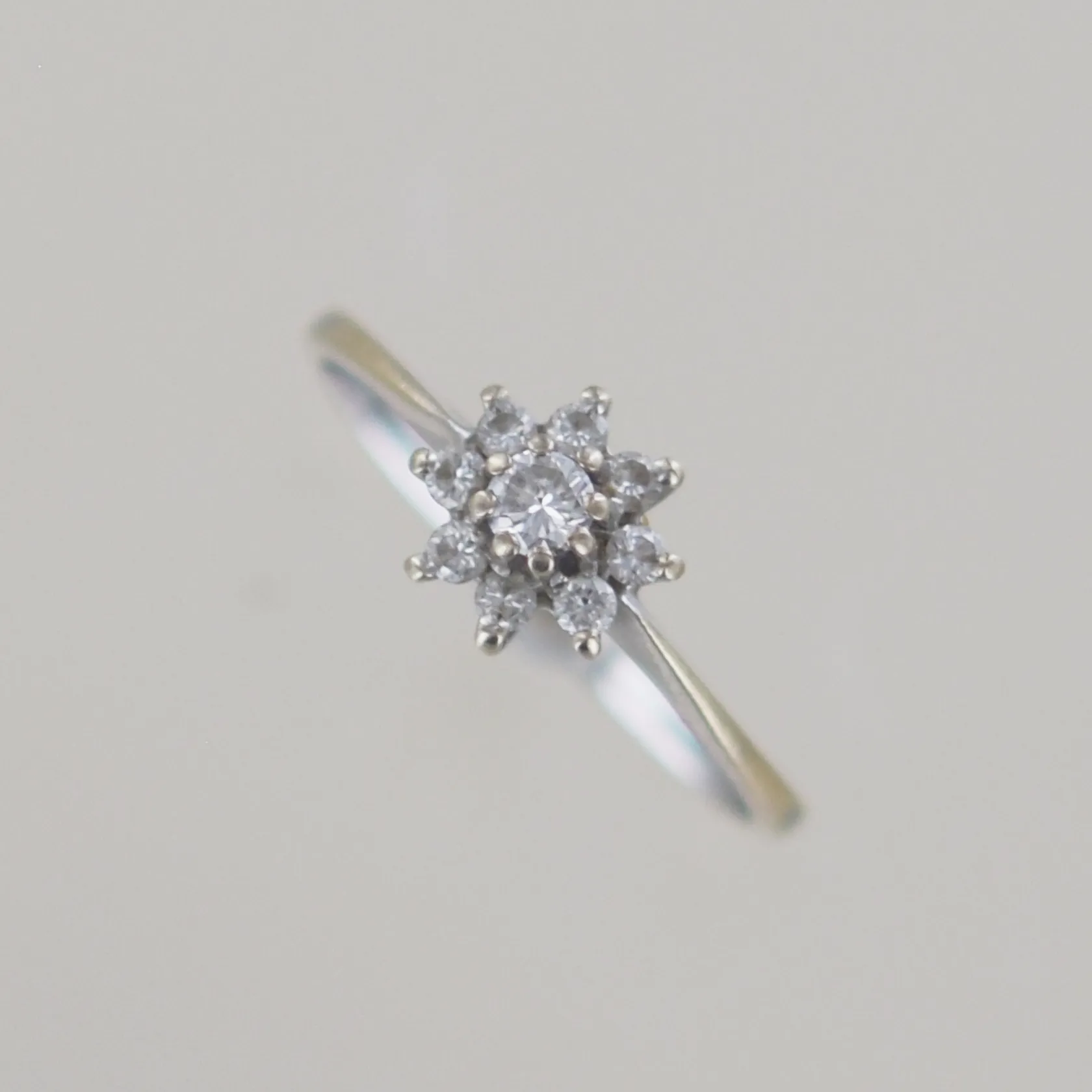 Ring med diamanter 1x 0,05ct + 8 x 0,01ct VS, Ø 16 mm, blommans bredd 6 mm, vitguld 18k Vikt: 1,5 g.