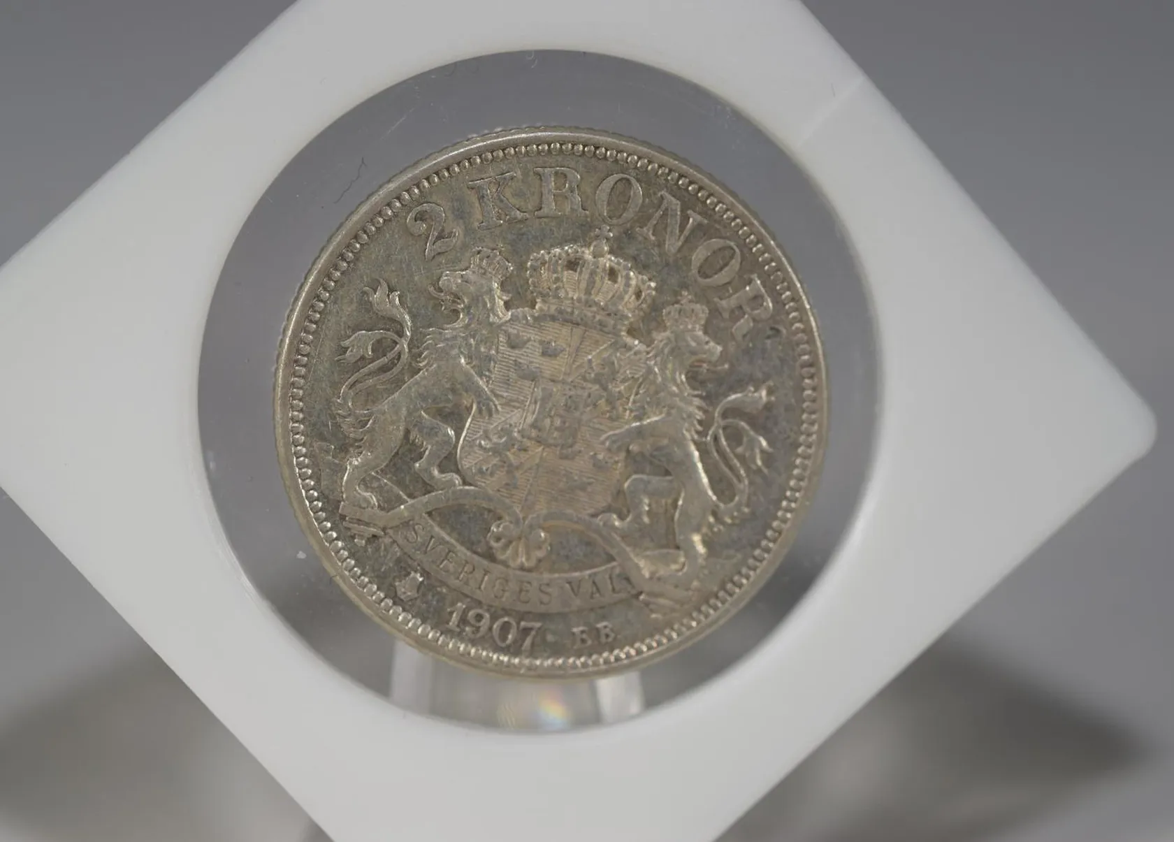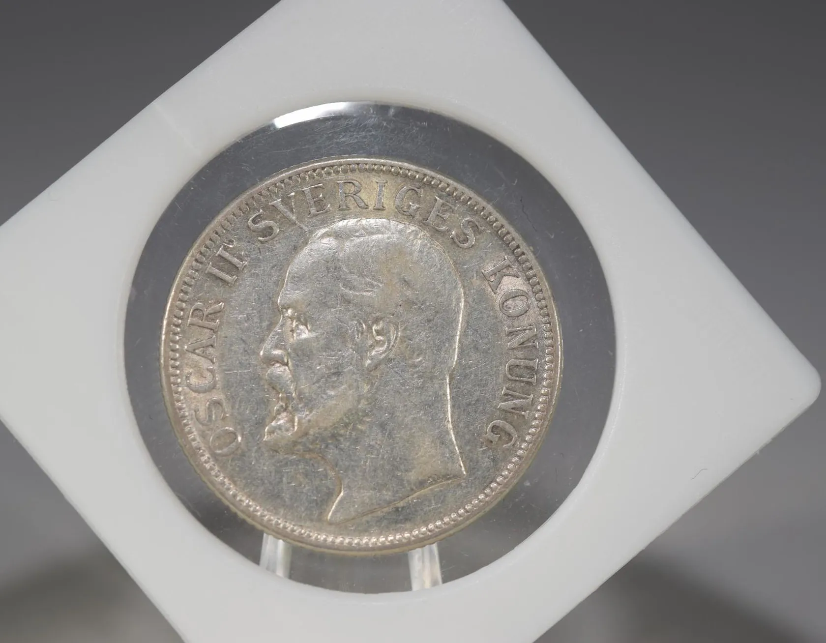 Jubileumsmynt, Oskar II 1907 Sveriges Konung 2kronor, silver 800/1000 Vikt: 14,9 g.