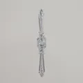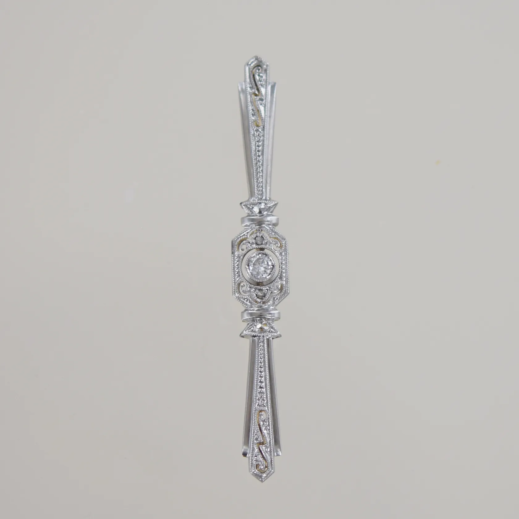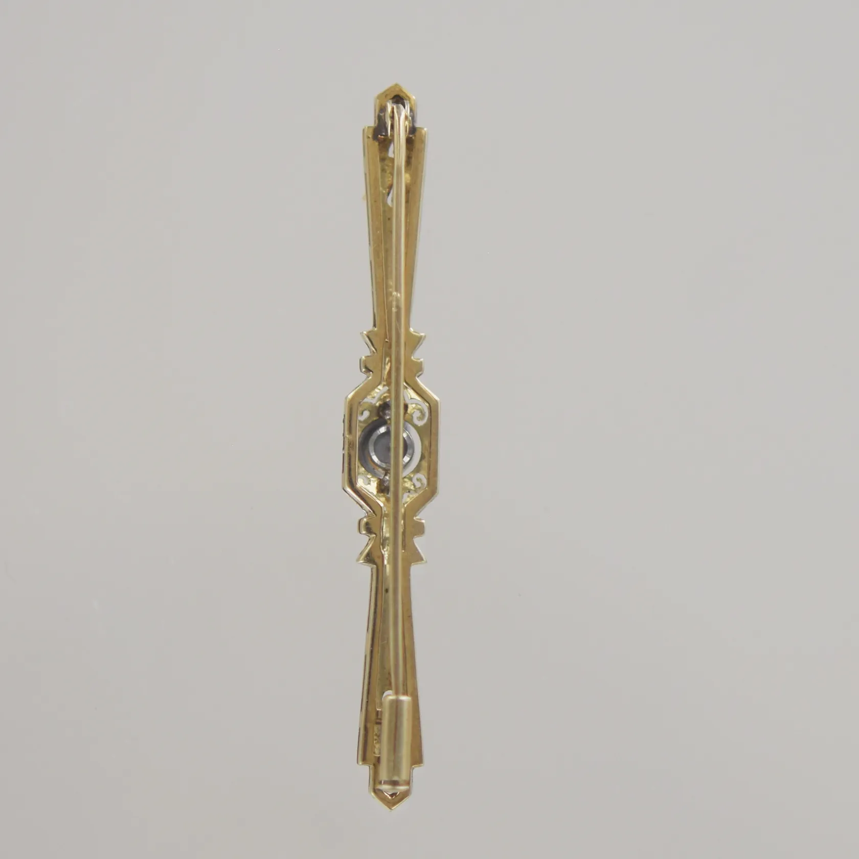 Brosch med diamant 0,10ct W/TW (H/F). VS god slipning + 2 st rosenstenar. Längd 5 cm bredd 6,6 mm, vitguld/rödguld 14k Vikt: 3,2 g.